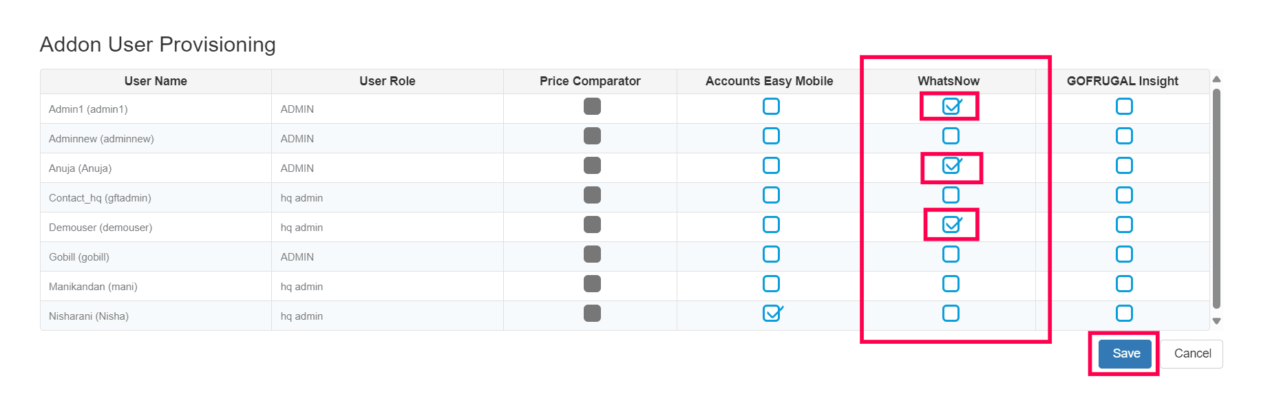 This screen displays a range of addons such as Accounts Easy Mobile, WhatsNow, and GOFRUGAL Insights, among others. If you wish to activate the WhatsNow app for the owner and the manager, start by identifying the WhatsNow column. Then, mark the checkbox for each user you intend to include. Once you have made your selections, click Save to apply the changes.