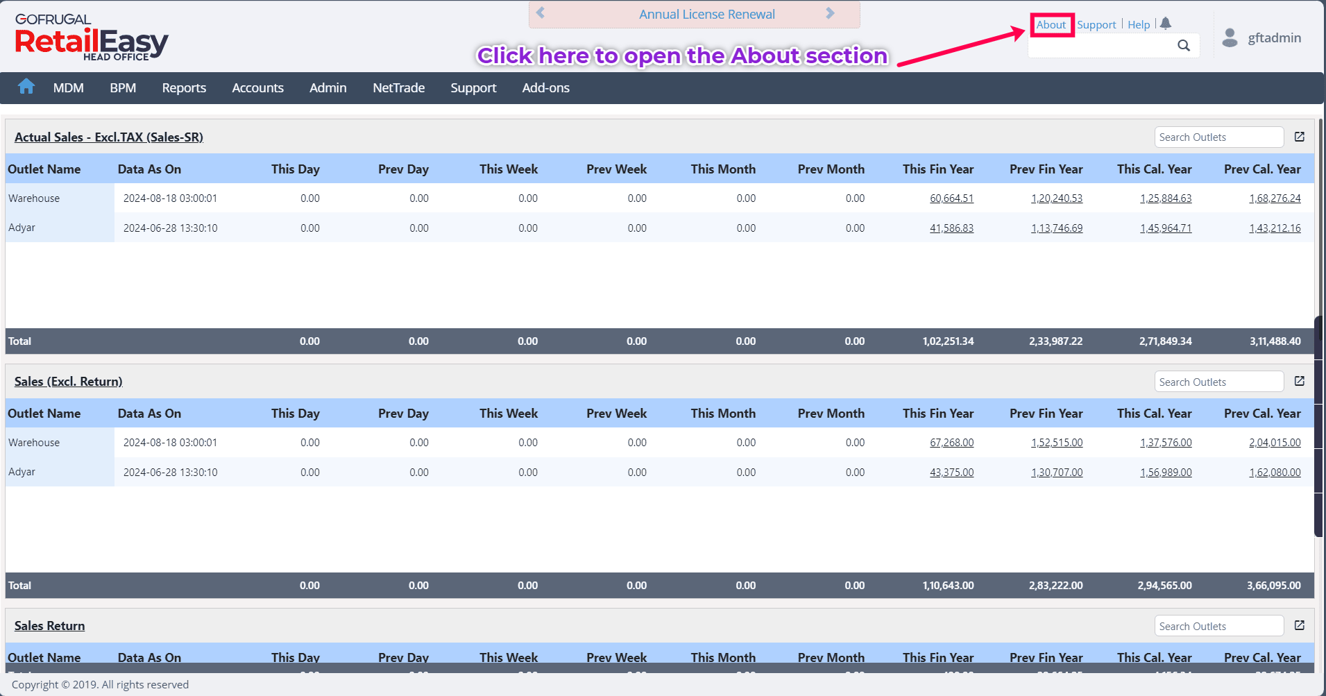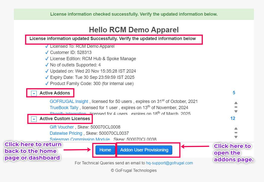 Click on Update License to open the license information page. This section provides license information, including details such as Licensed To, Customer ID, License Edition, Number of Outlets, Last Updated, License Expiry Date, and Product Family. Furthermore, you will also find information regarding any "Active Addons" and "Active Custom Licenses" that you have purchased.