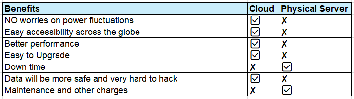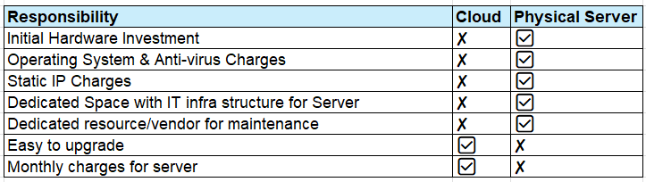 Points to be understood and acknowledged by the customer when choosing an on-premise physical server over a cloud server: