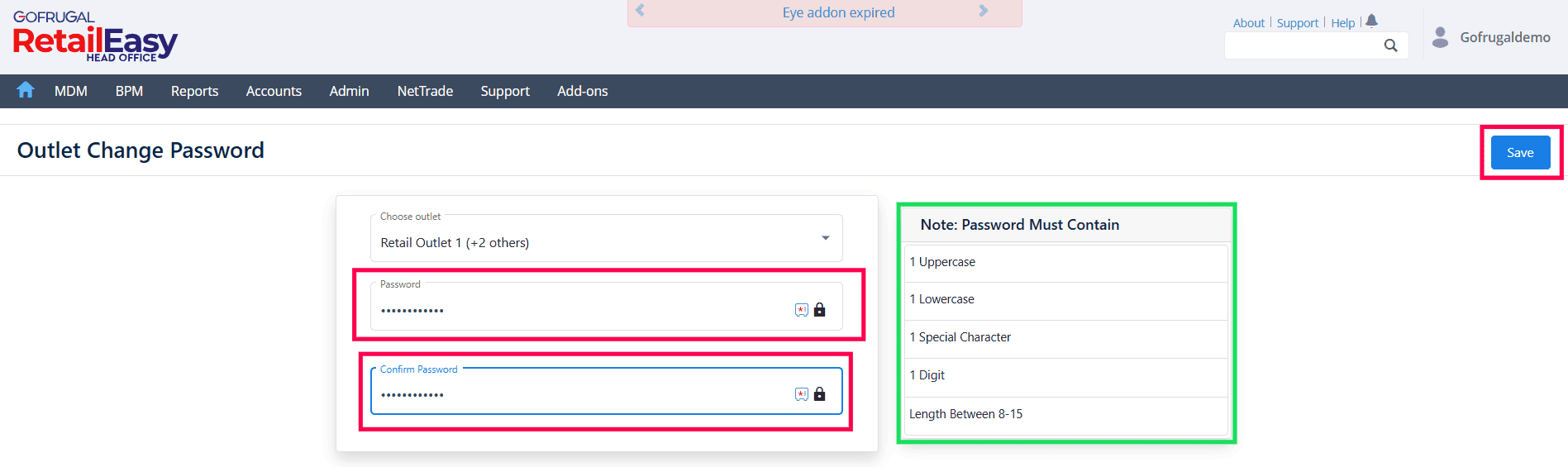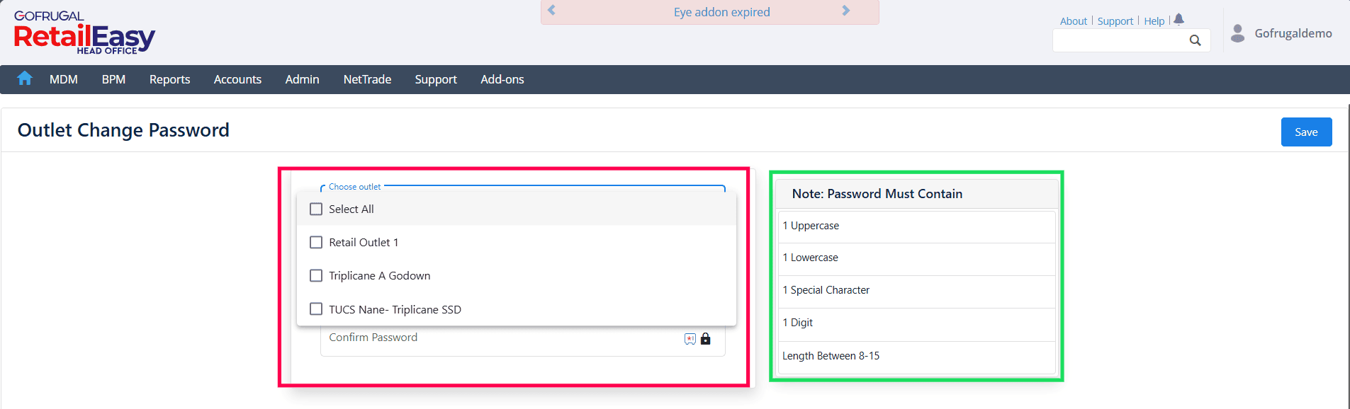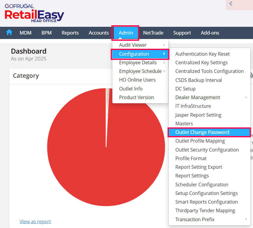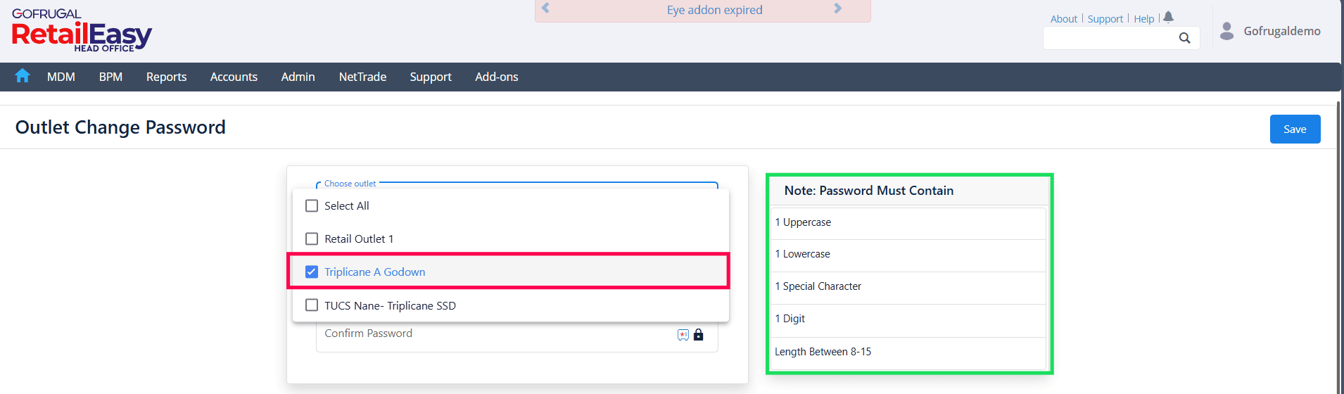 Outlet Change Password in Gofrugal HQ is a security feature that allows the Head Office (HO) to manage and update the login passwords of outlet users. This ensures that outlet access credentials are controlled centrally and can be modified whenever required.