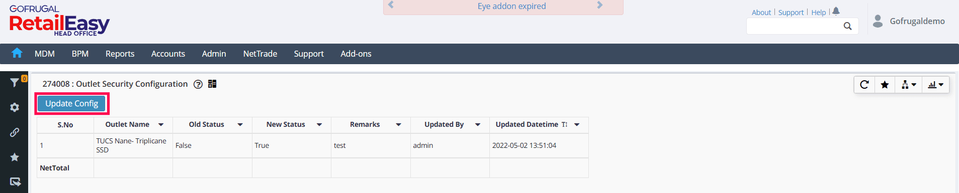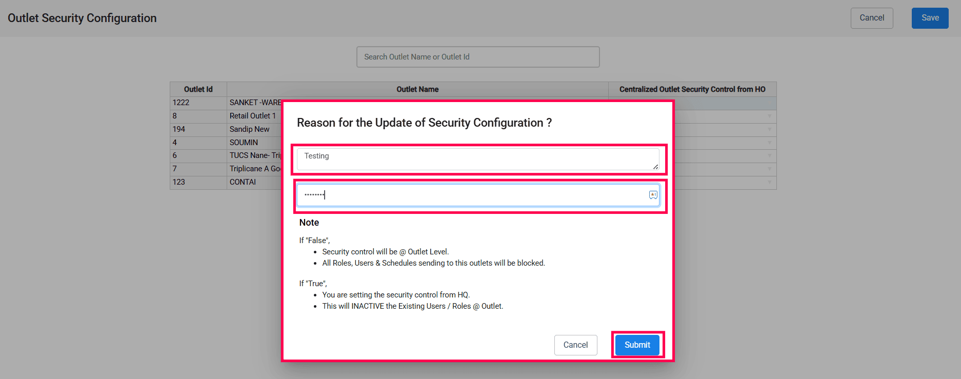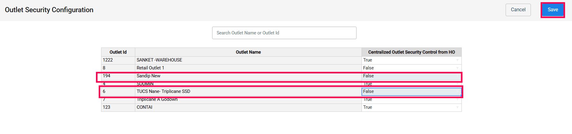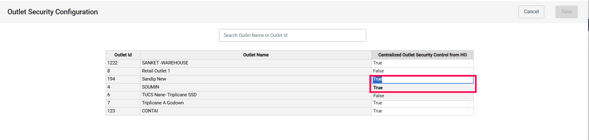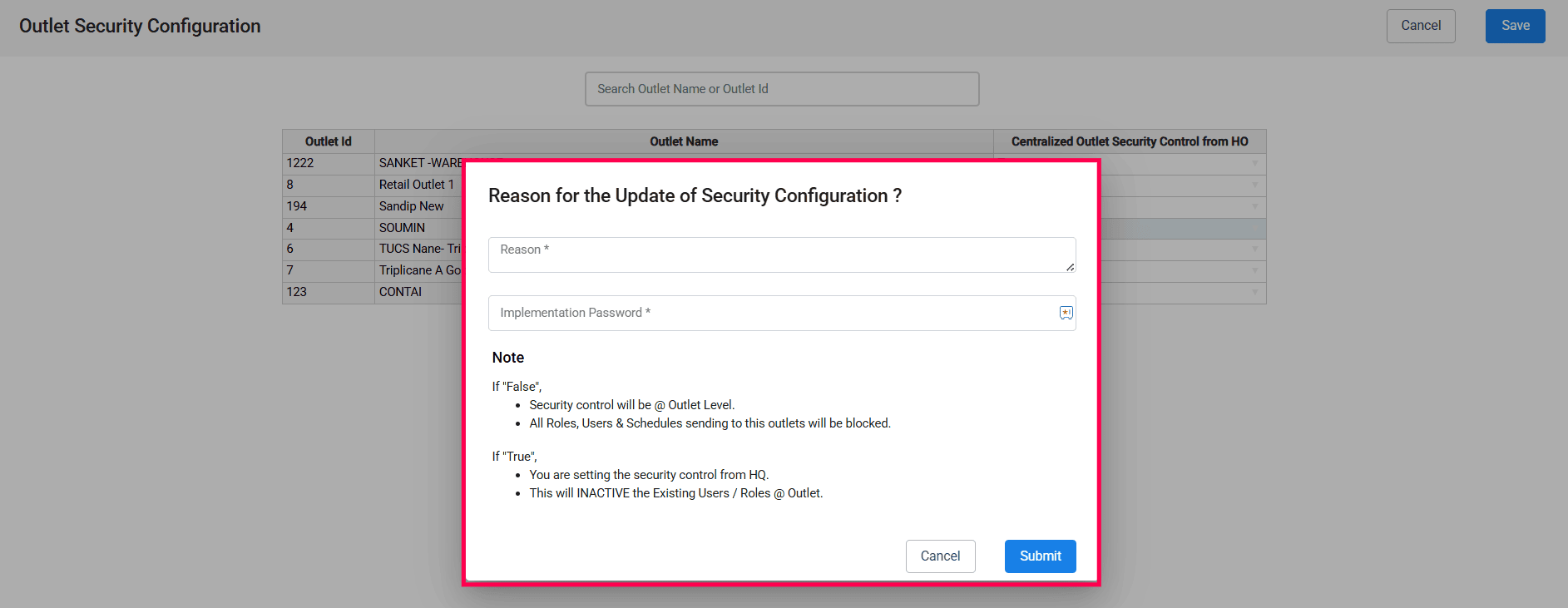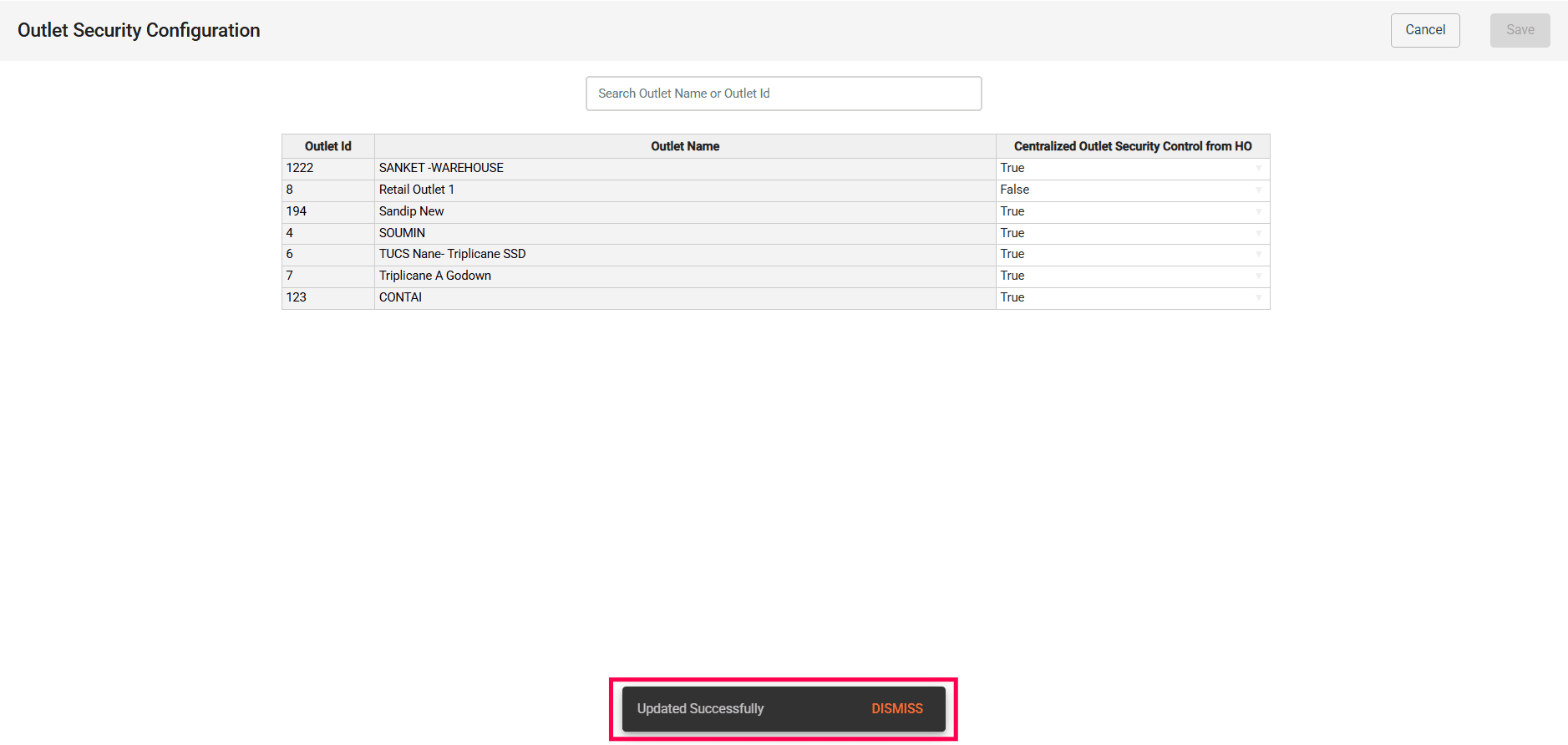 The Outlet Security Configuration screen allows you to centrally manage and update outlet-level security settings directly from Headquarters (HQ). This enables quick and consistent security adjustments across all outlets.