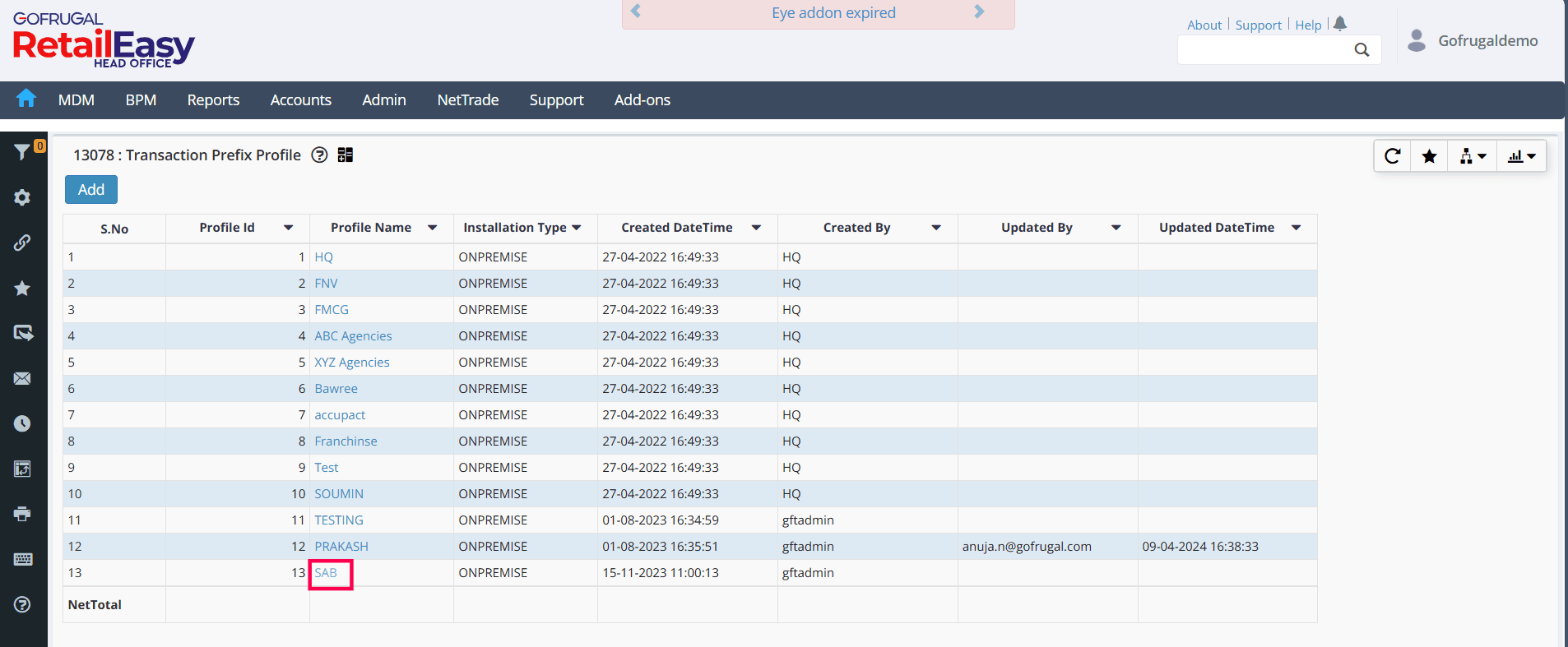 In such cases, the Transaction Prefix Profile screen helps you manually associate newly added outlets with the required transaction prefix.