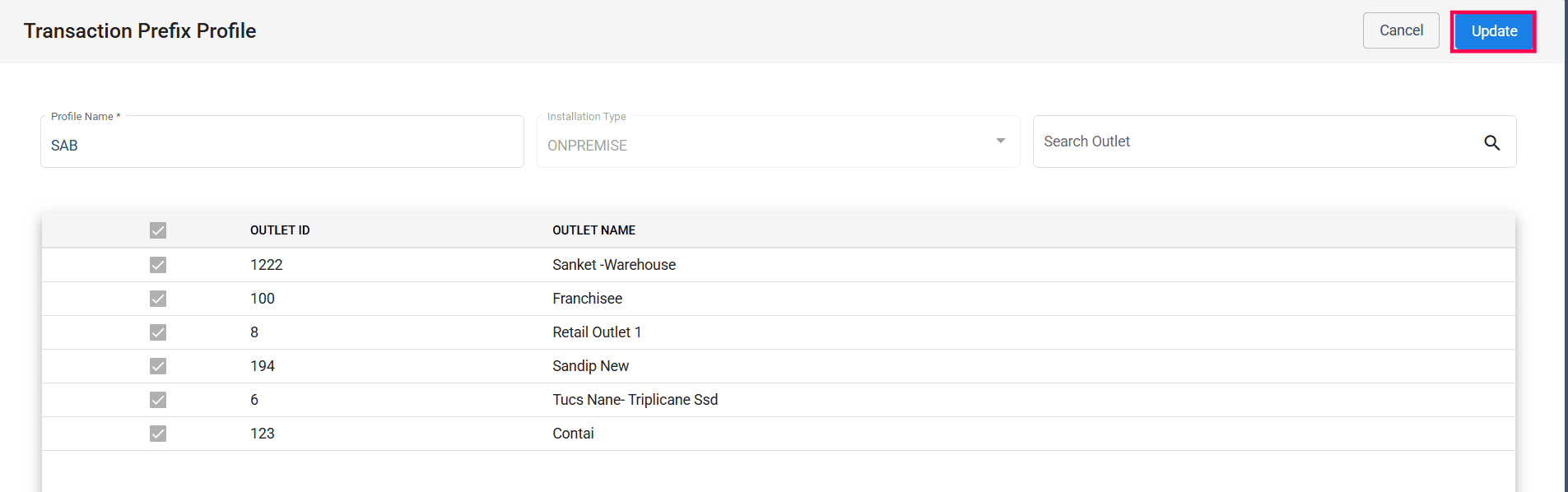 Select the outlets you want to map to the Transaction Prefix, then click Update to save the changes.
