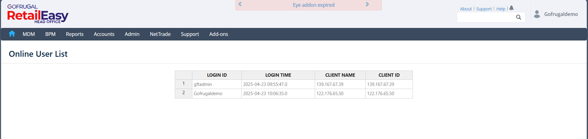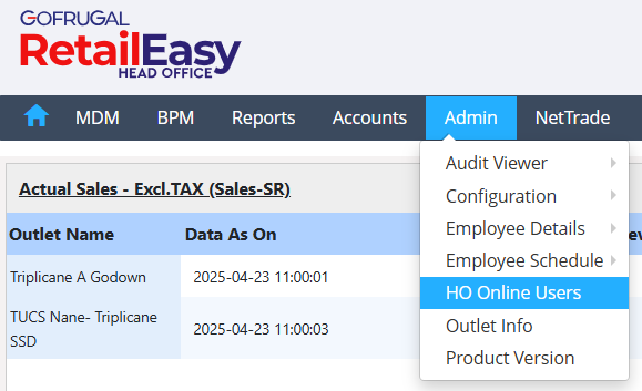 HO Online Users in Gofrugal HQ is a monitoring feature that displays the list of users currently logged in and active at the Head Office (HO). It provides real-time visibility into user sessions, helping administrators track system usage and activity.