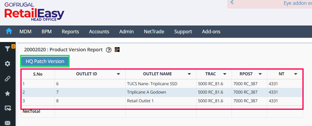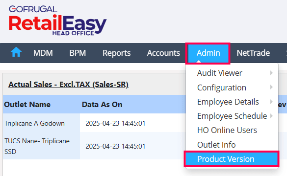 These screens help you and the GoFrugal support team identify the software versions running at the outlets and HQ. This information allows them to perform re-installations if necessary.