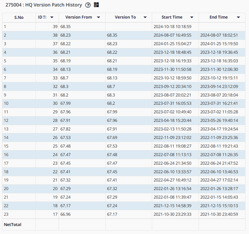On this screen, you can view the ID, Version From, Version To, Start Time, and End Time.