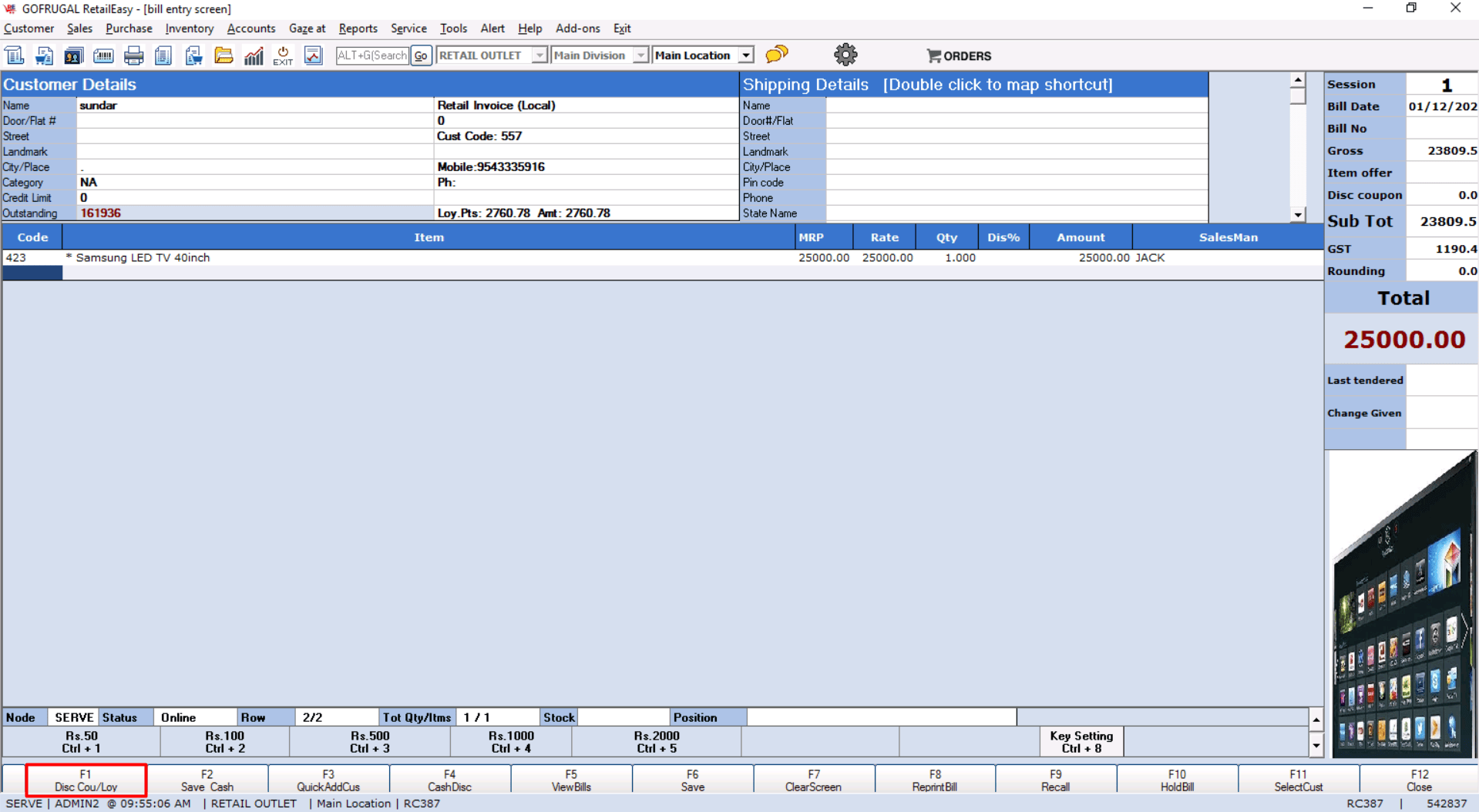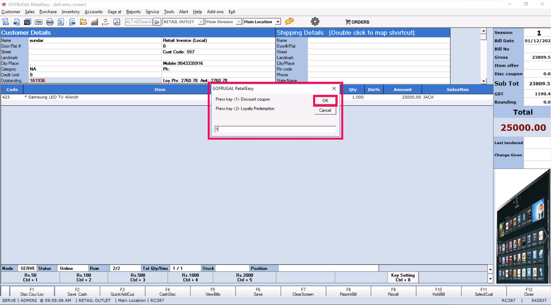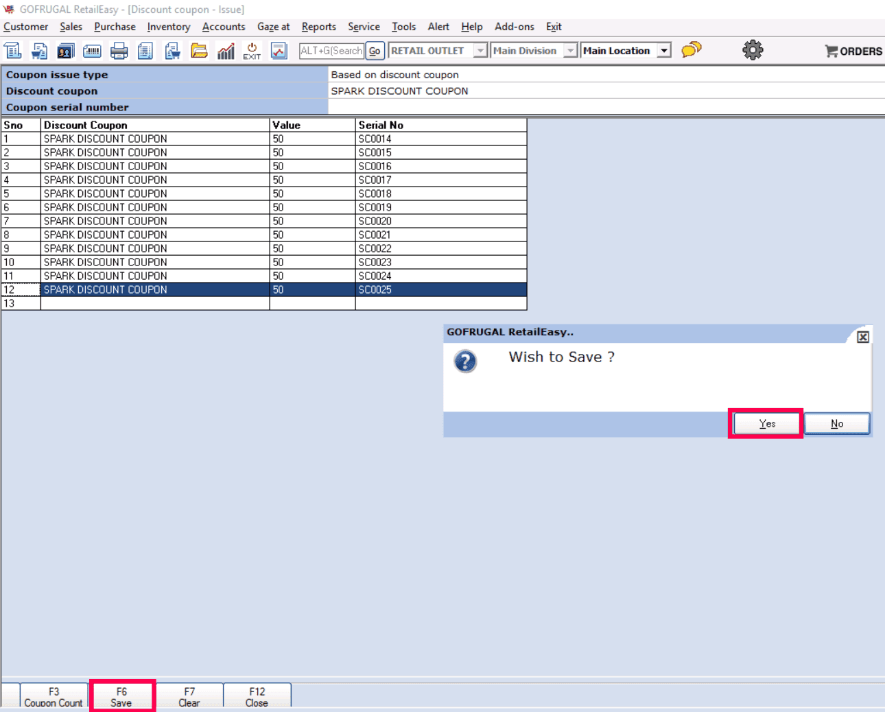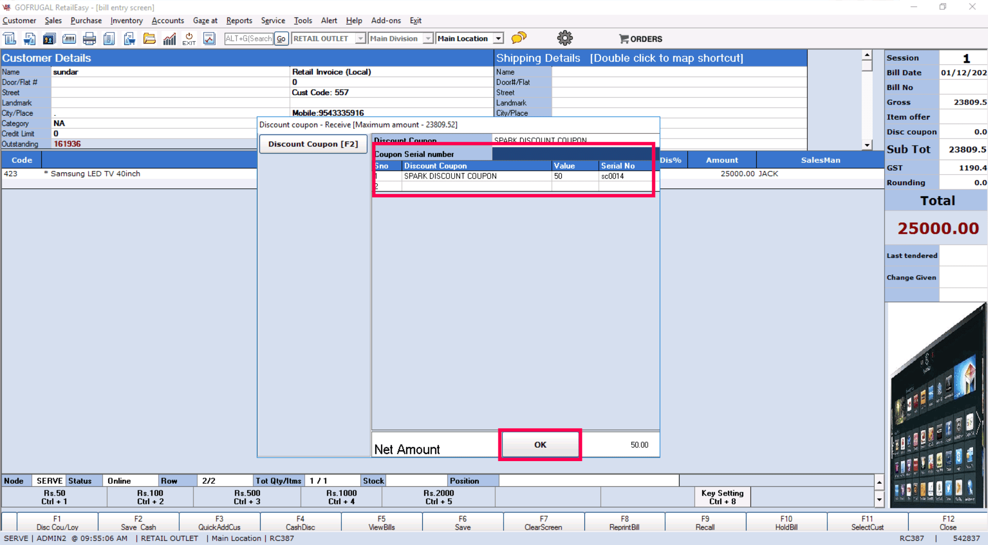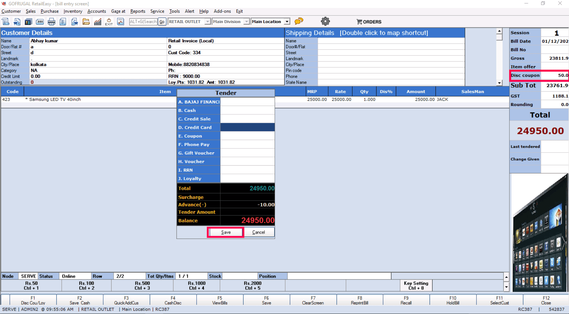 Note: The discount coupon will be applied and shown on the right side as Disc coupon. To save the bill, press the F6 Save button or the Esc key.