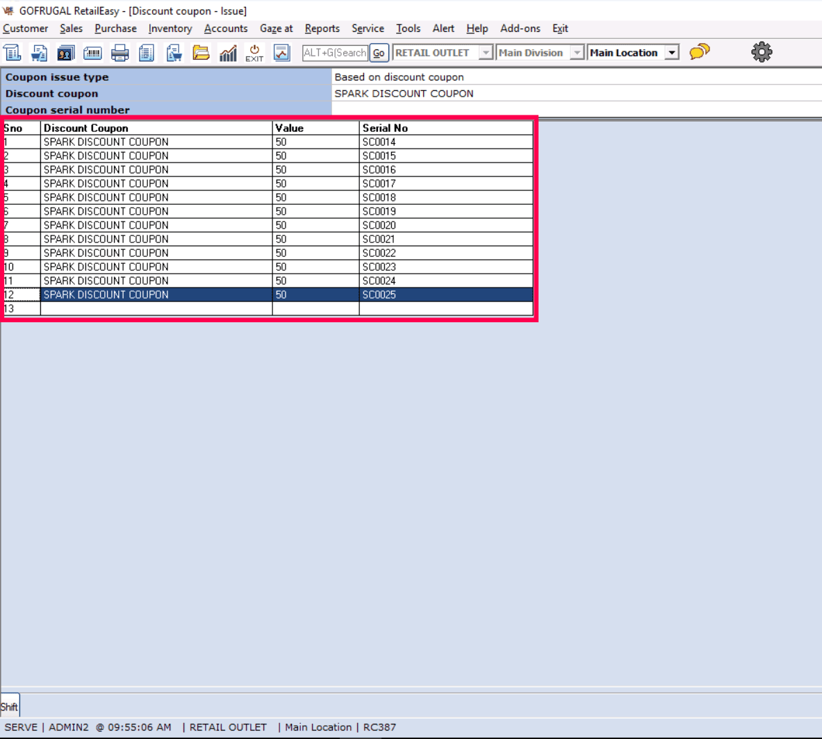 Select the discount coupon name from the list, then type the allocated coupon serial numbers manually.