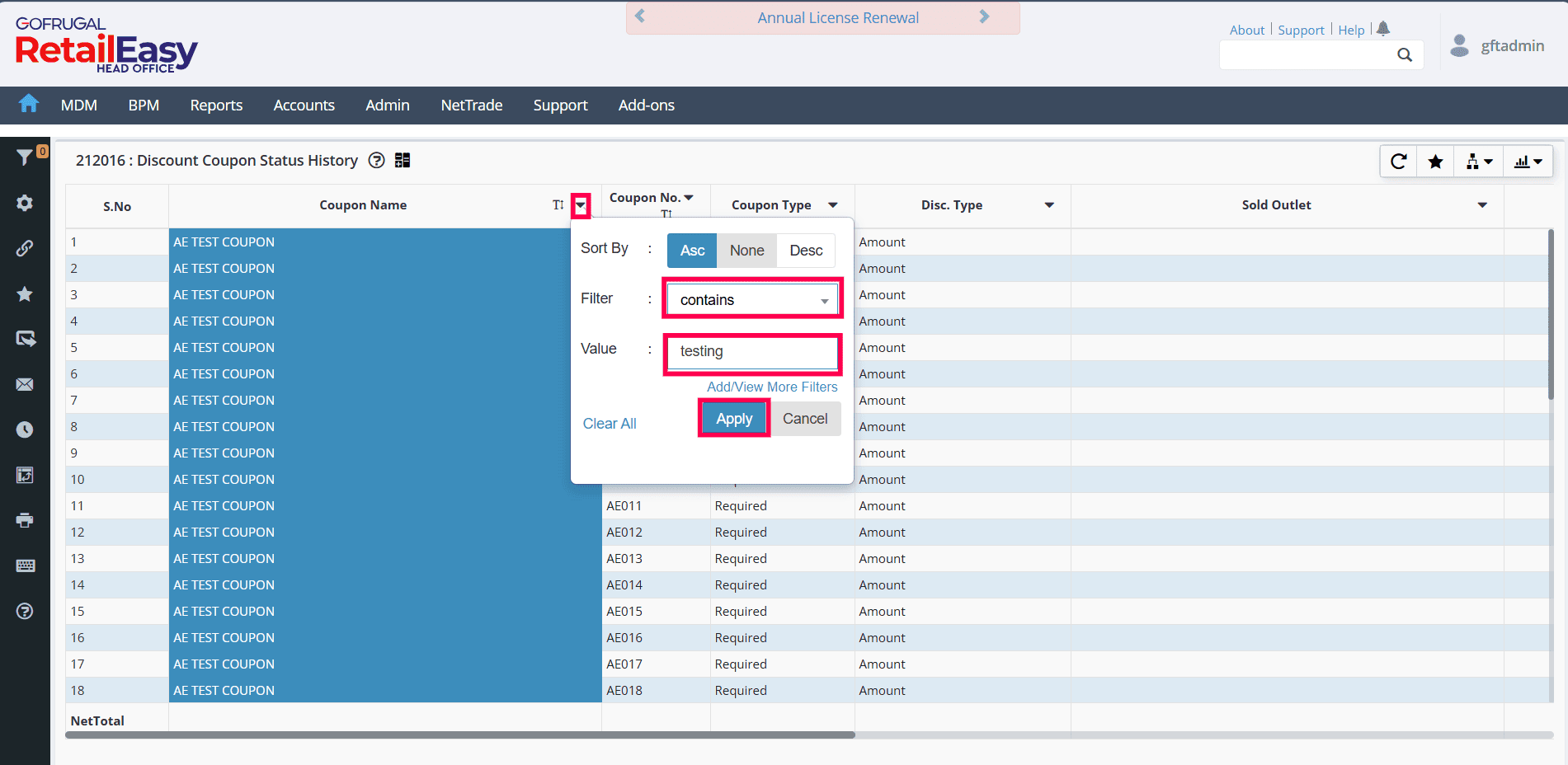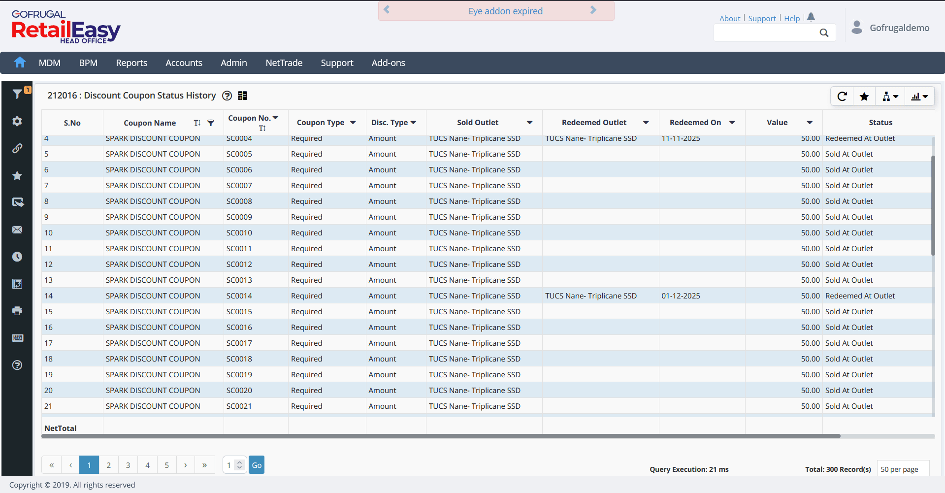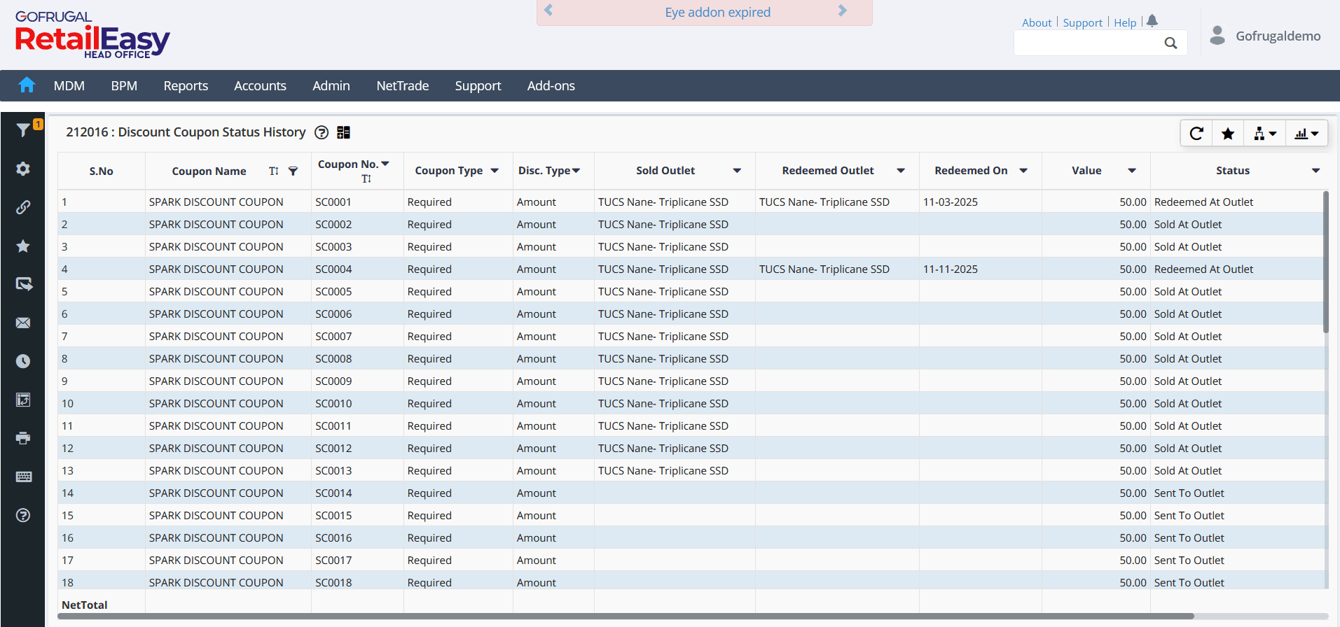 The Discount Coupon Status History report in Gofrugal HQ provides complete tracking details of issued discount coupons.