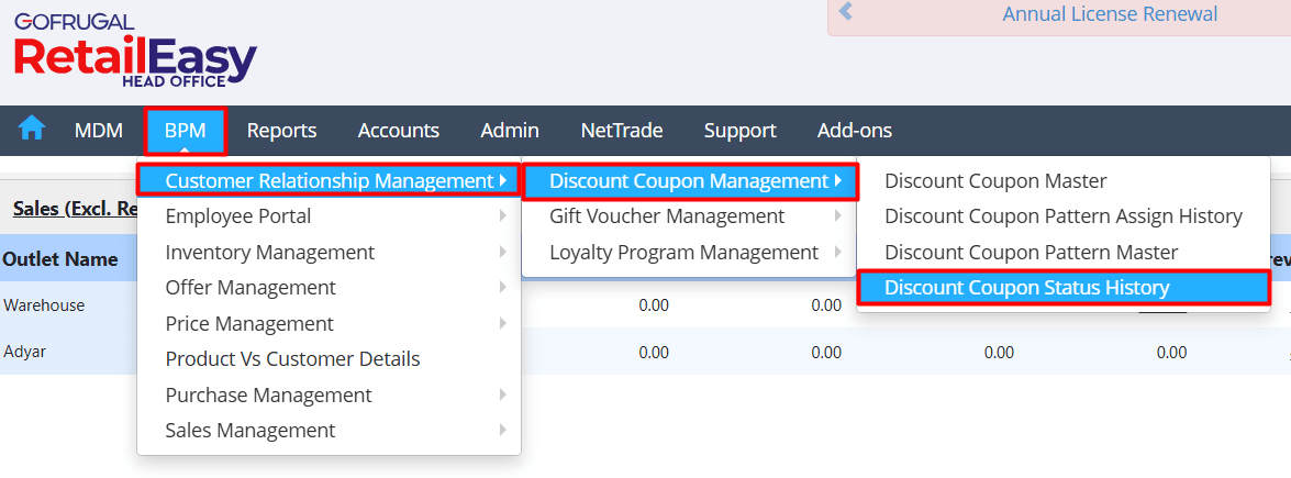 The Discount Coupon Status History report ensures transparency, accountability, and effective management of promotional coupons across the retail network.