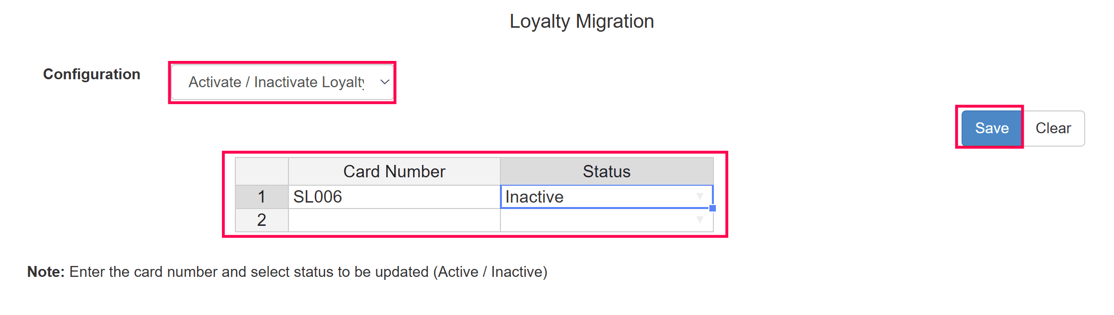 Enter the Loyalty Card Number and select the required status (Active or Inactive).