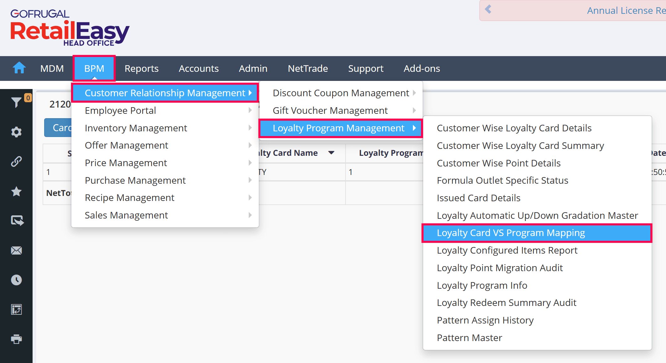 Navigate to BPM > Customer Relationship Management > Loyalty Program Management > LOyalty Card Vs Program Mapping.