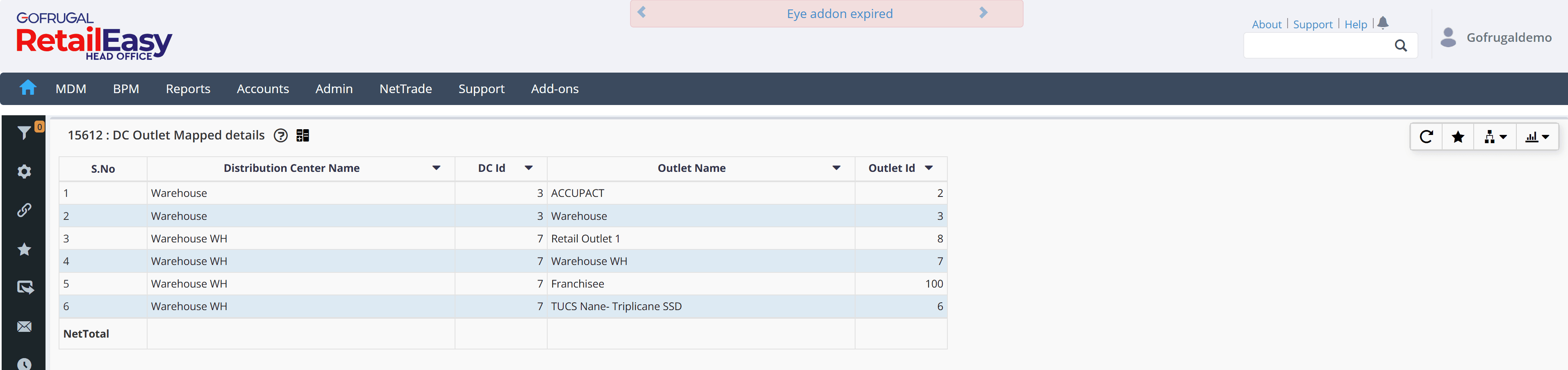 In this report, you will get the information about the Distribution Center Name, DC ID, Outlet Name, and Outlet ID.