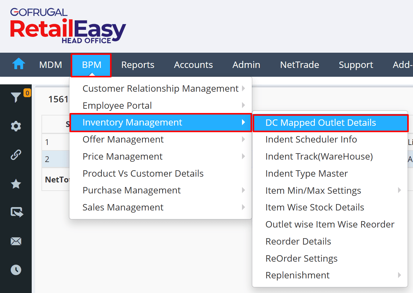 Navigate to BPM > Inventory Management > DC Mapped Outlet Details.