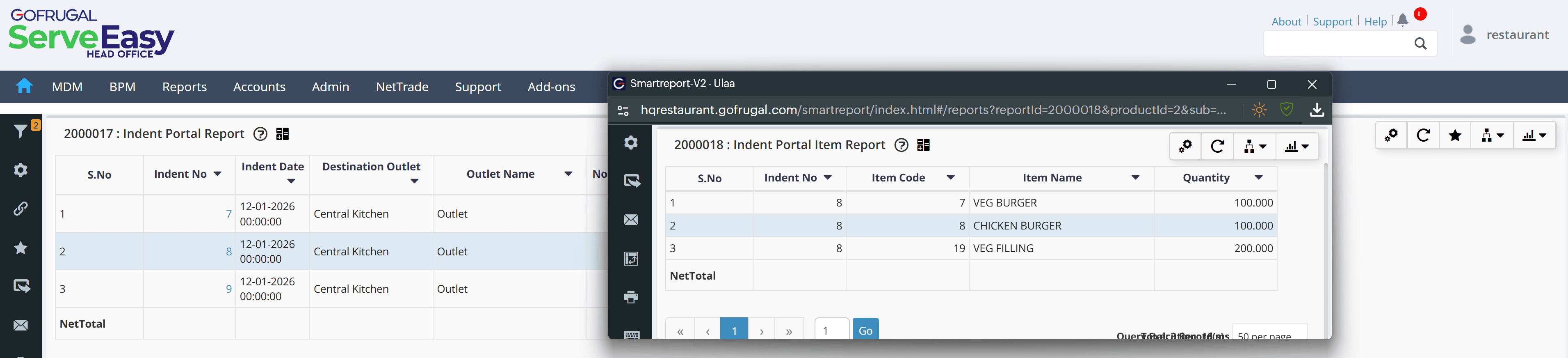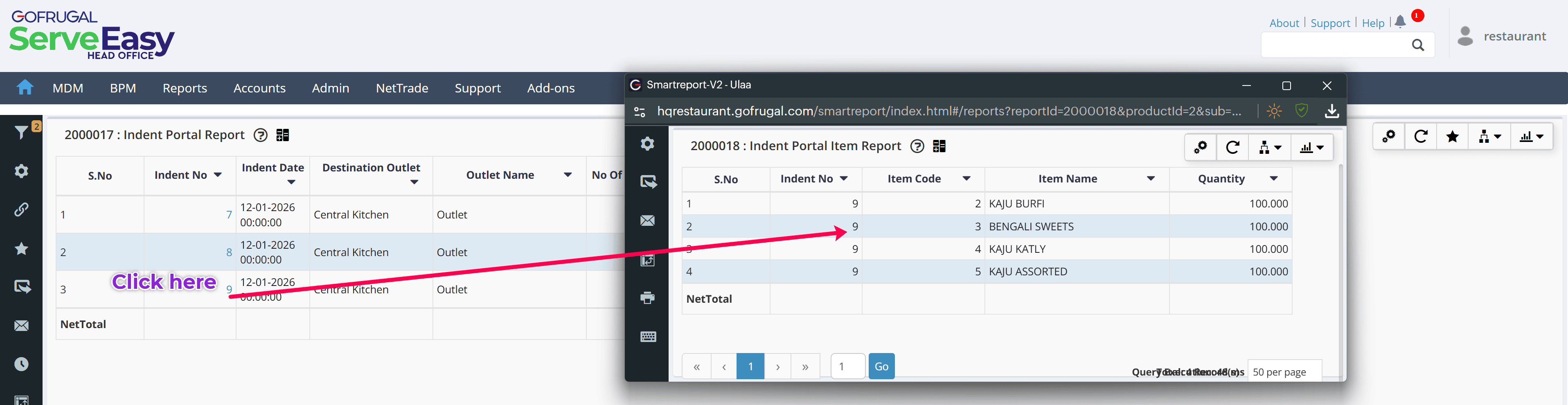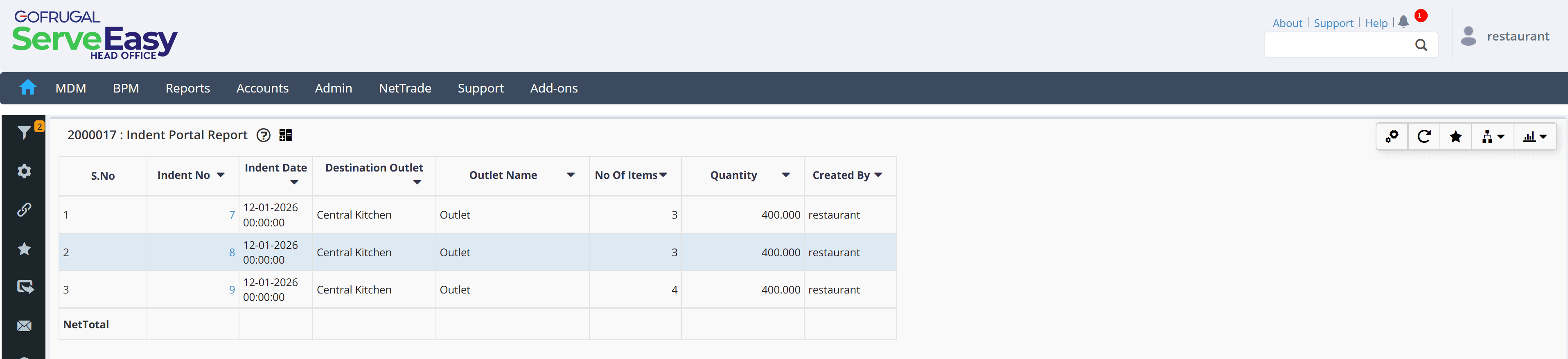 You will get the details like Indent No, Indent Date, Destination Outlet, Outlet Name [From Outlet], No of Items, Quantity, and Created By.