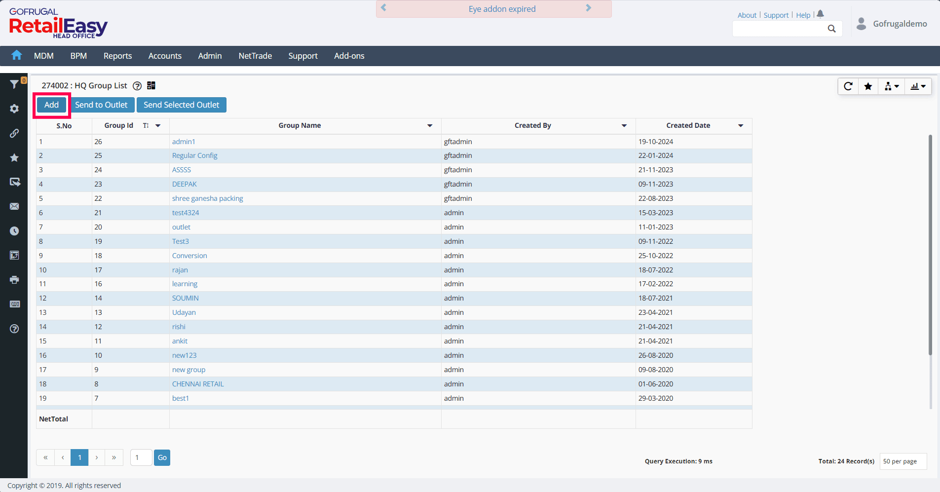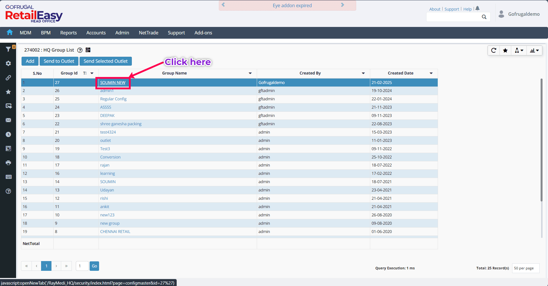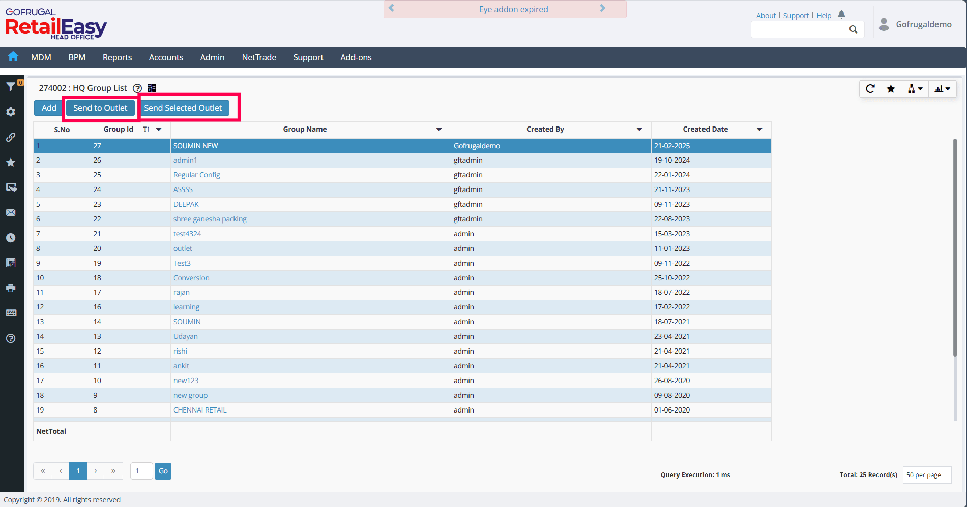 Click Send to Outlet or Send Selected Outlet to send the HQ Group to all outlets.
