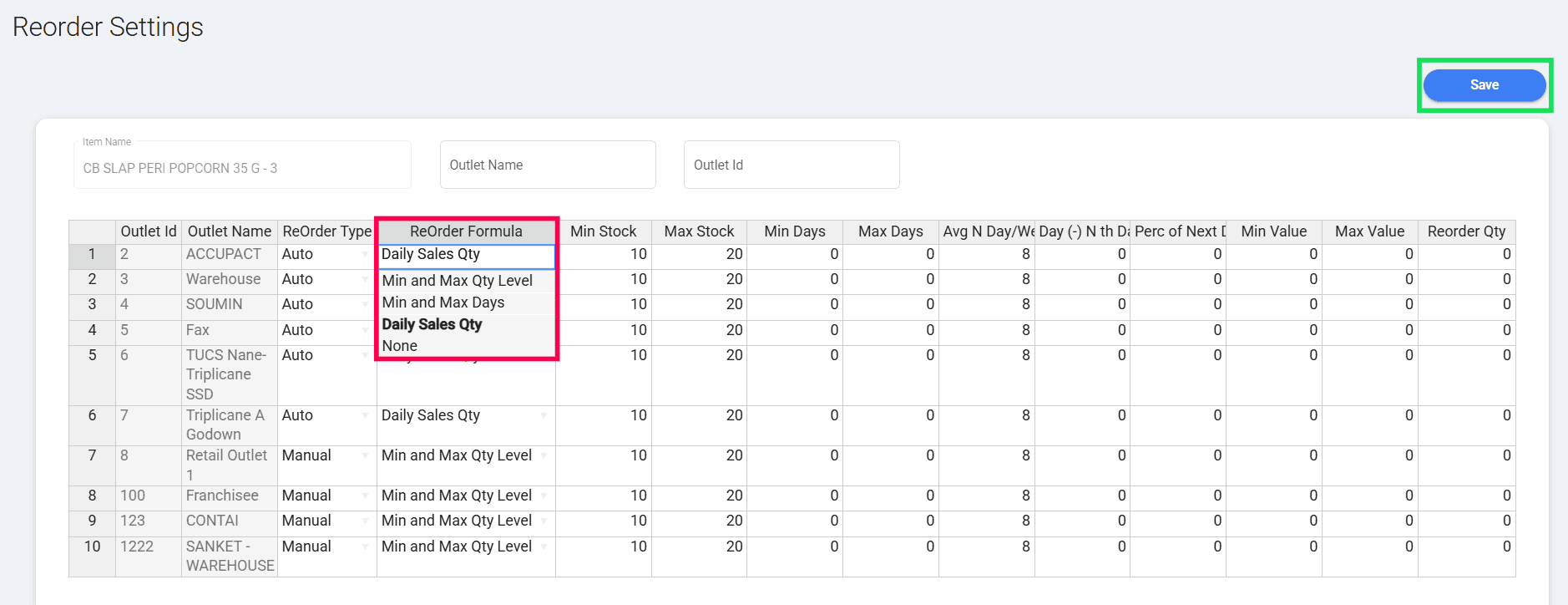 In the ReOrder Formula column, choose from the following options: Min and Max Qty Level, Min and Max Qty Days, Daily Sales Qty, or None.