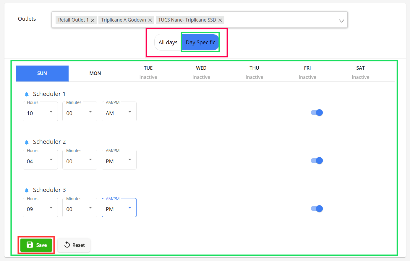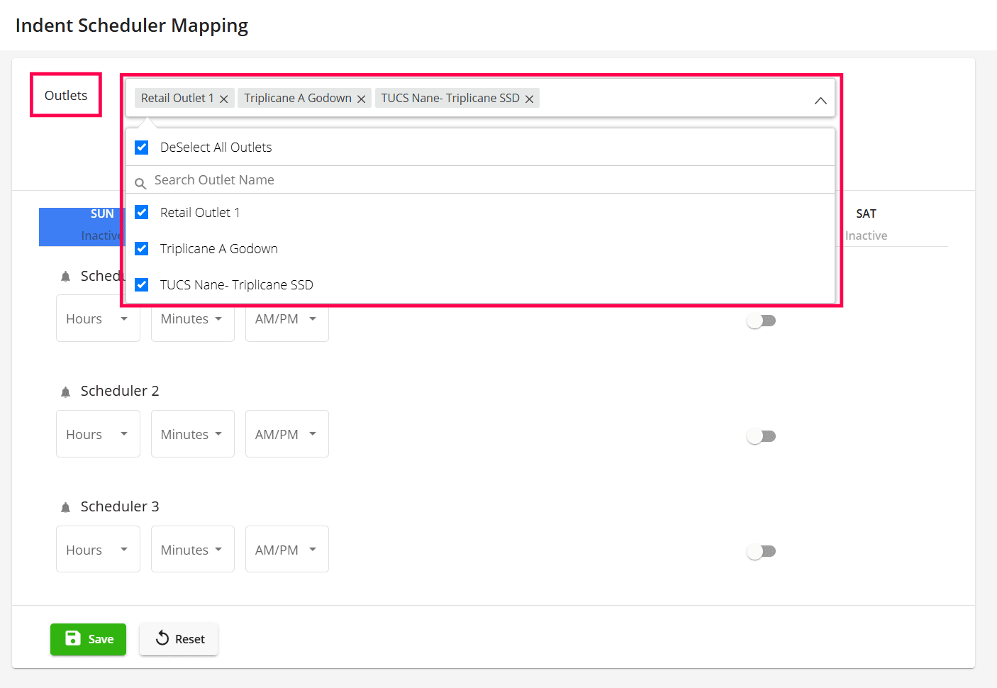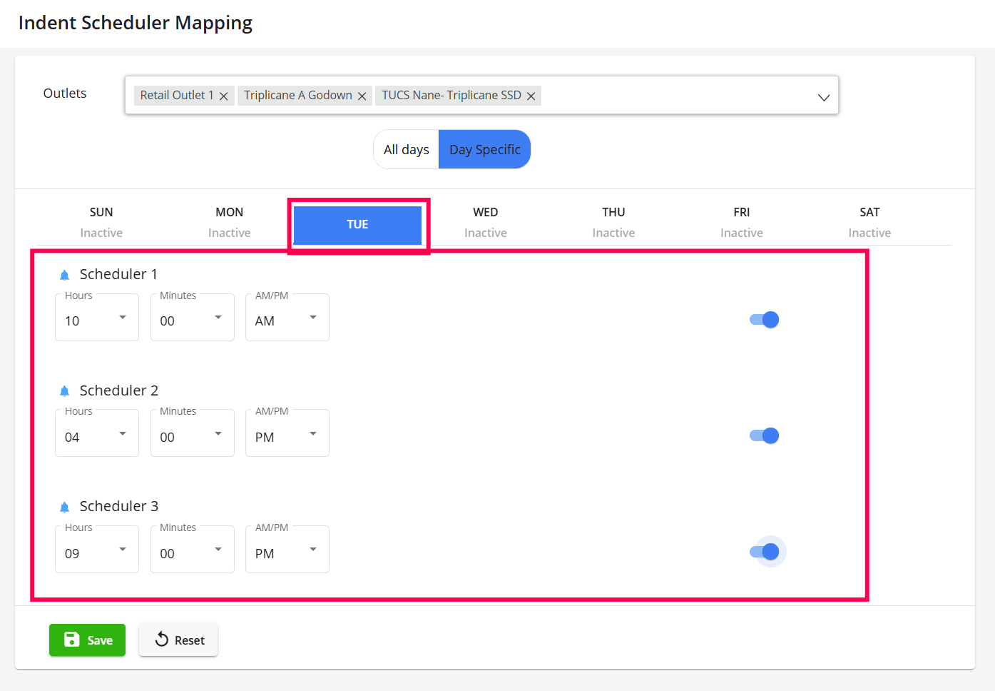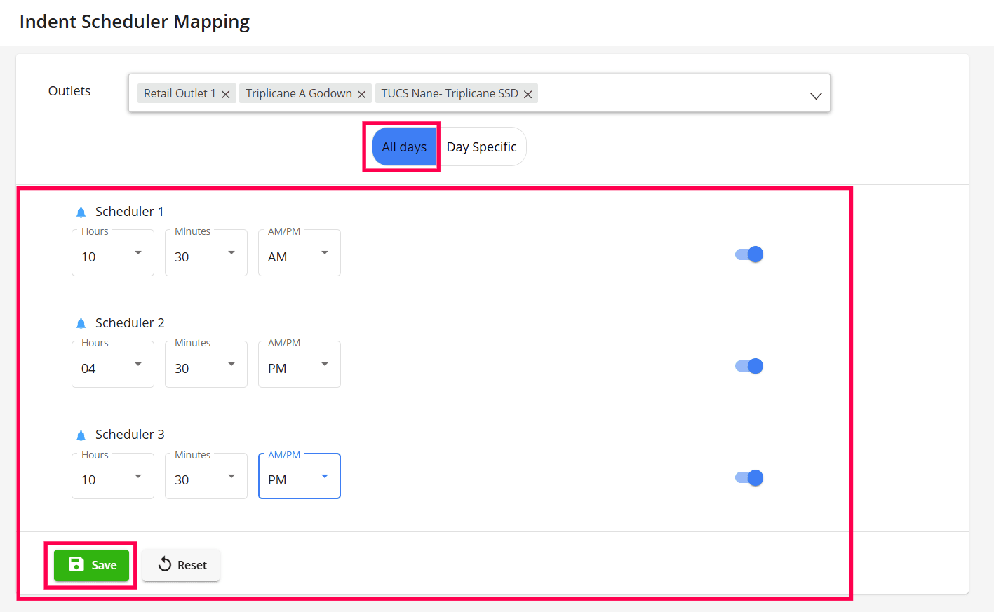 Set the times for Schedule 1, Schedule 2, and Schedule 3 by toggling the buttons as required. The three schedules will generate indents at the specified times daily for the entire week.