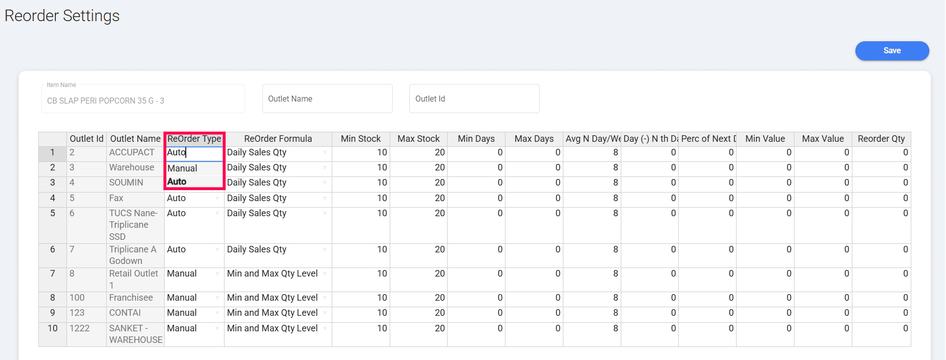 In the ReOrder Type column, two options are available: Manual and Auto. Manual refers to manual indents or purchase orders, while Auto refers to automatic indents or purchase orders.