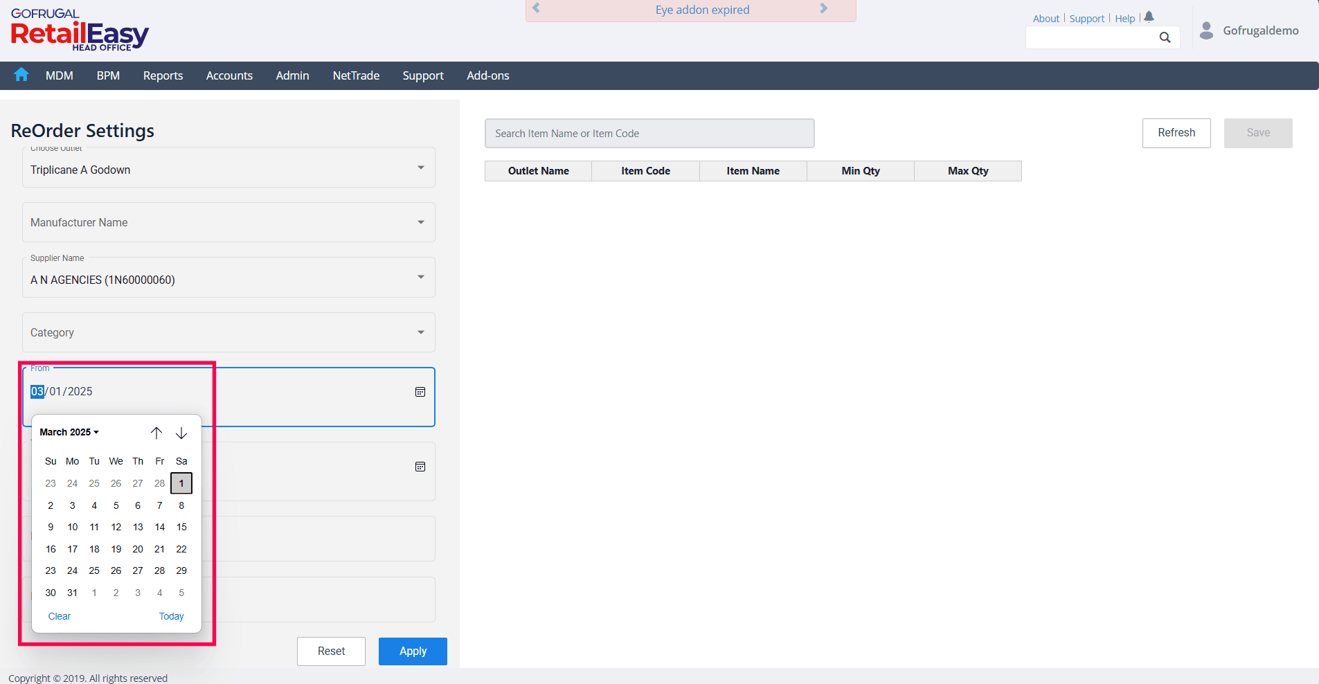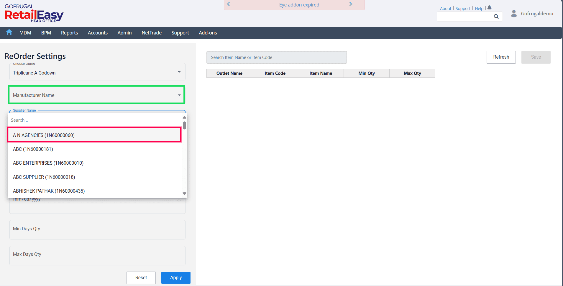 In Gofrugal HQ, the Reorder screen allows you to define minimum and maximum stock levels for outlets, suppliers, and items based on a selected date range and the required minimum and maximum days of stock. You can also apply filters by manufacturer and category. After saving the configuration, the system refreshes the minimum and maximum stock quantities for the selected items and outlets.