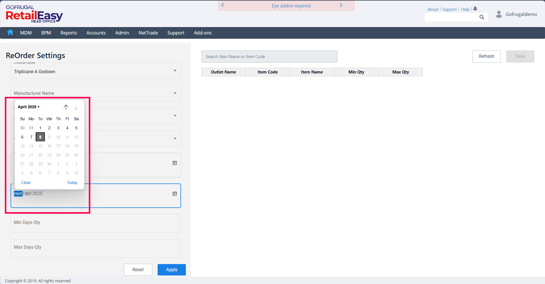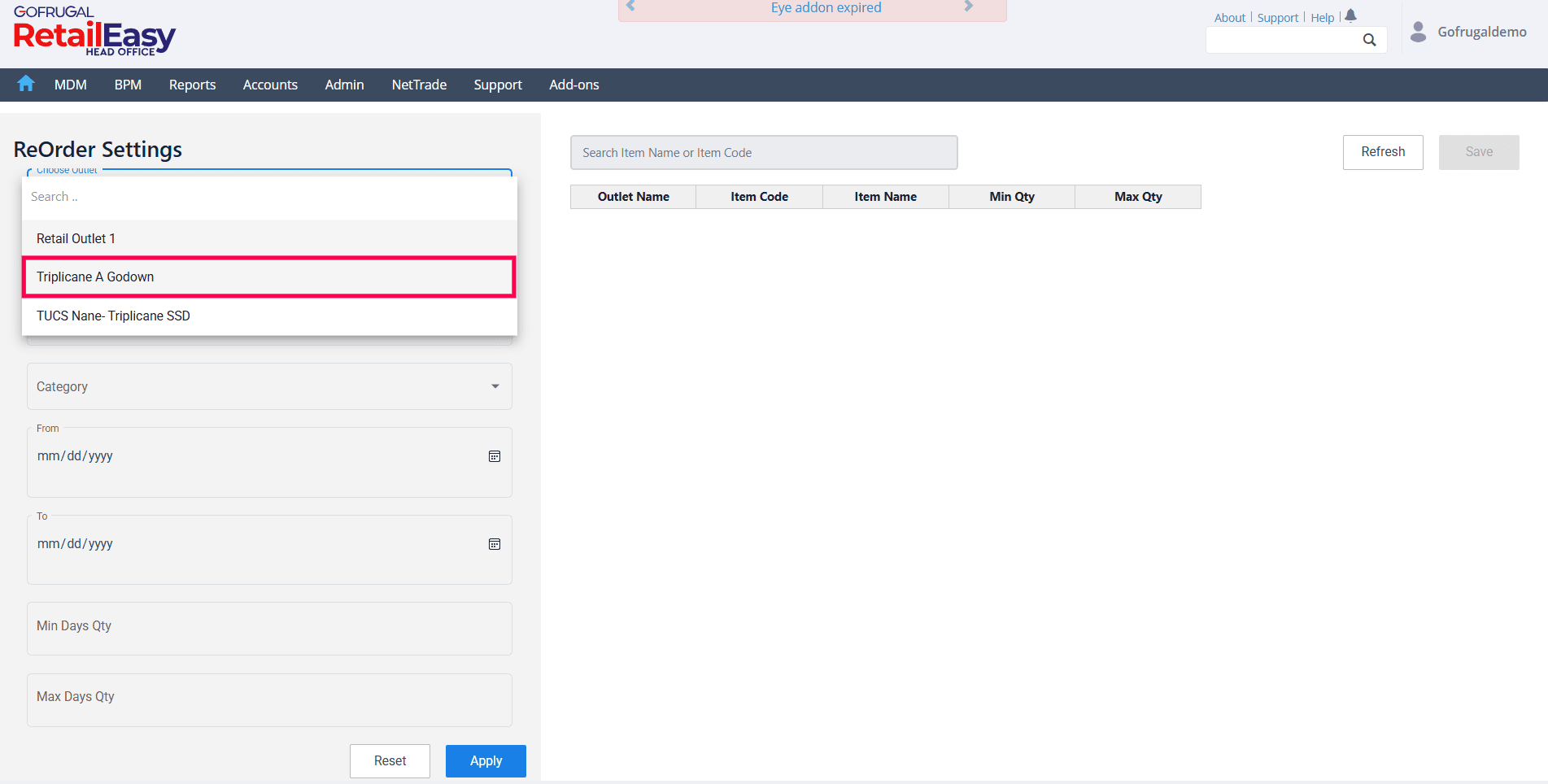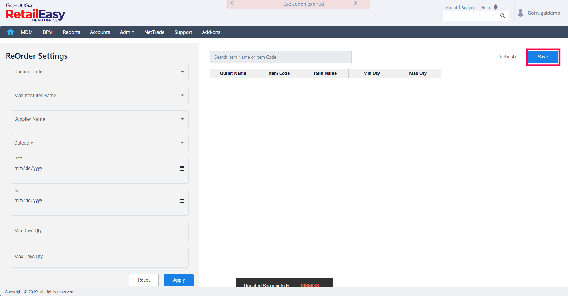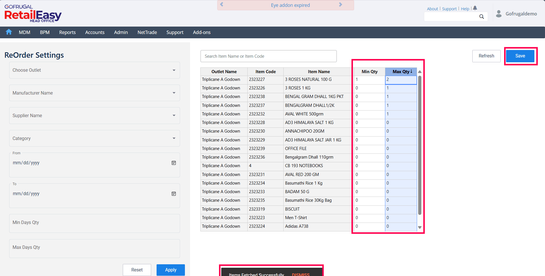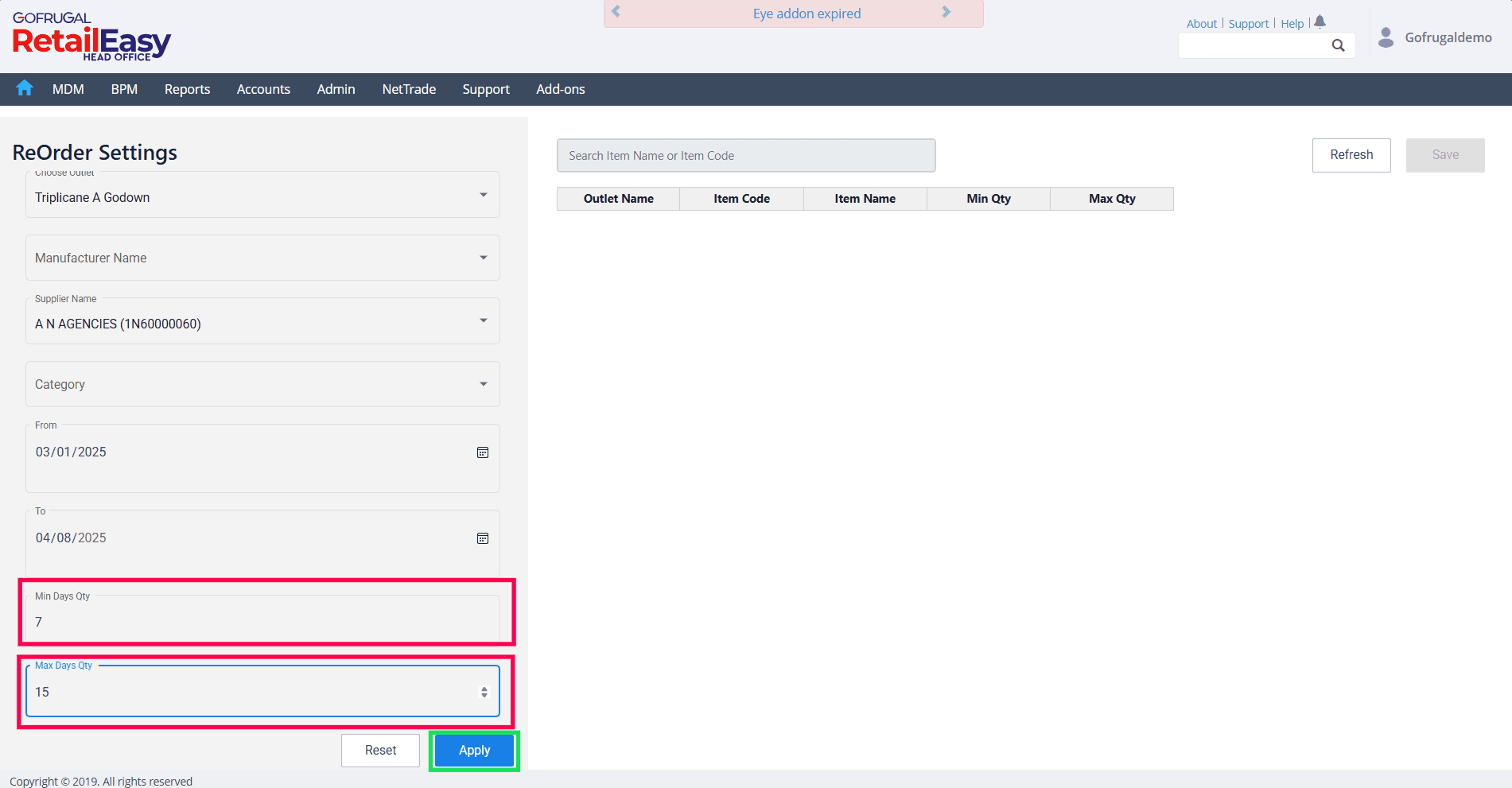 Click the Apply button to load the item-wise minimum and maximum quantities.