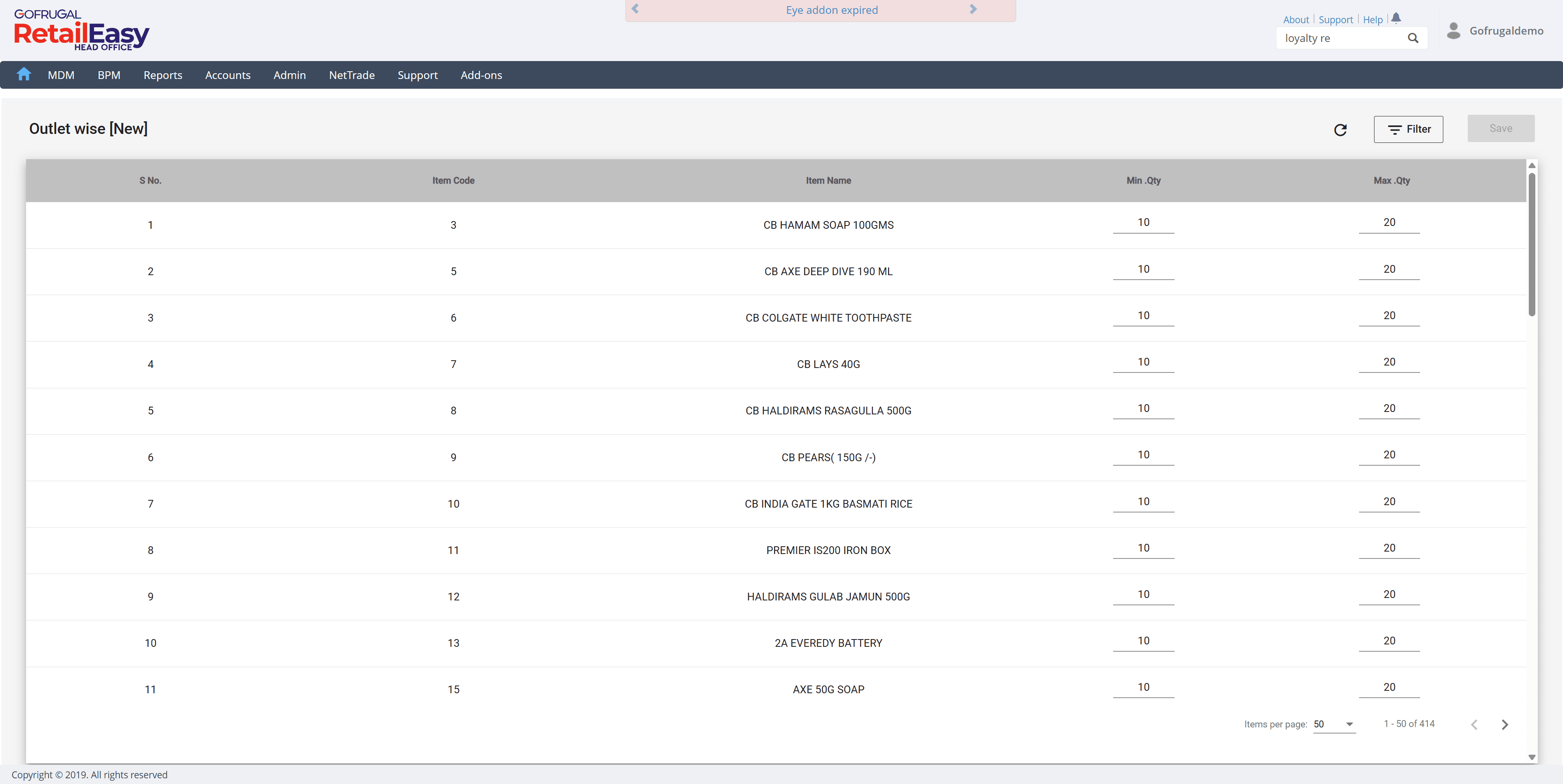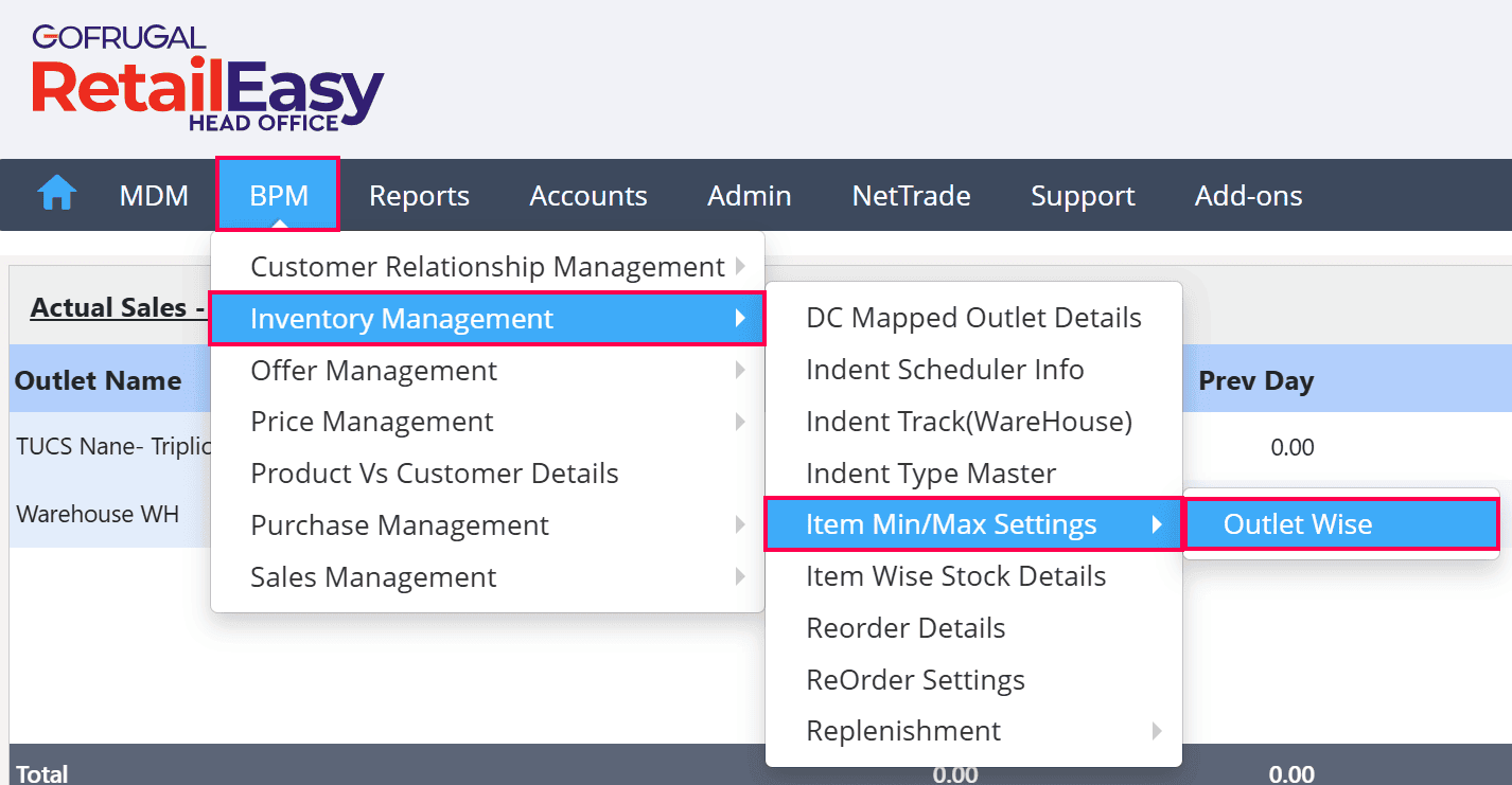 Navigate to BPM > Inventory Management > Item Min/Max Settings > Outlet Wise.