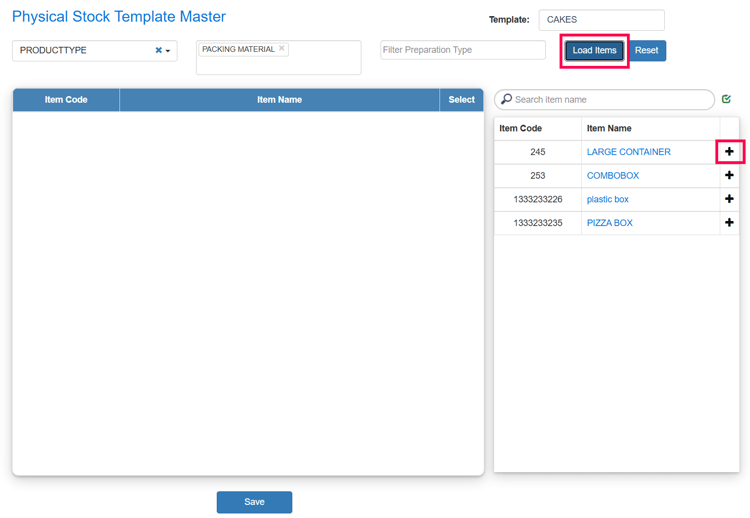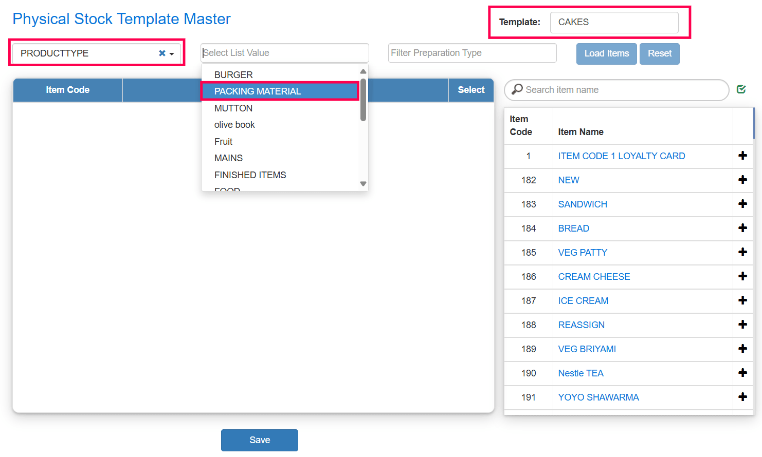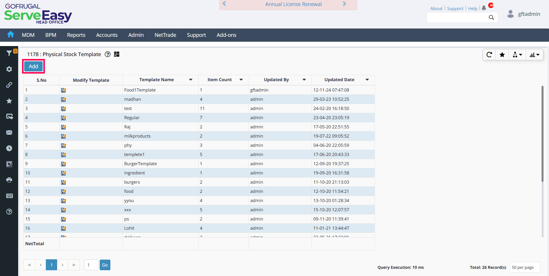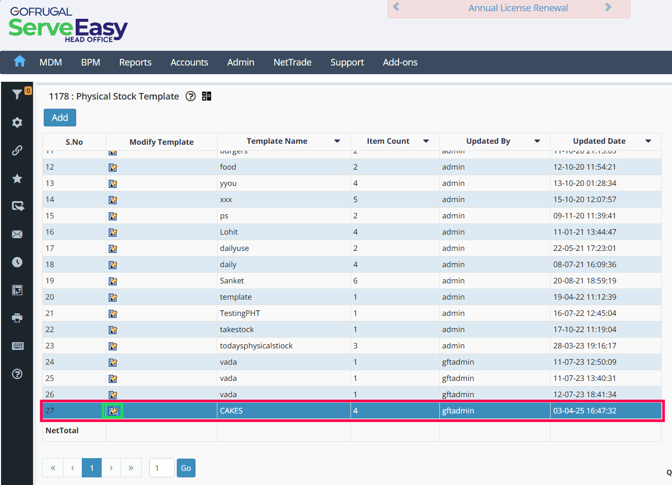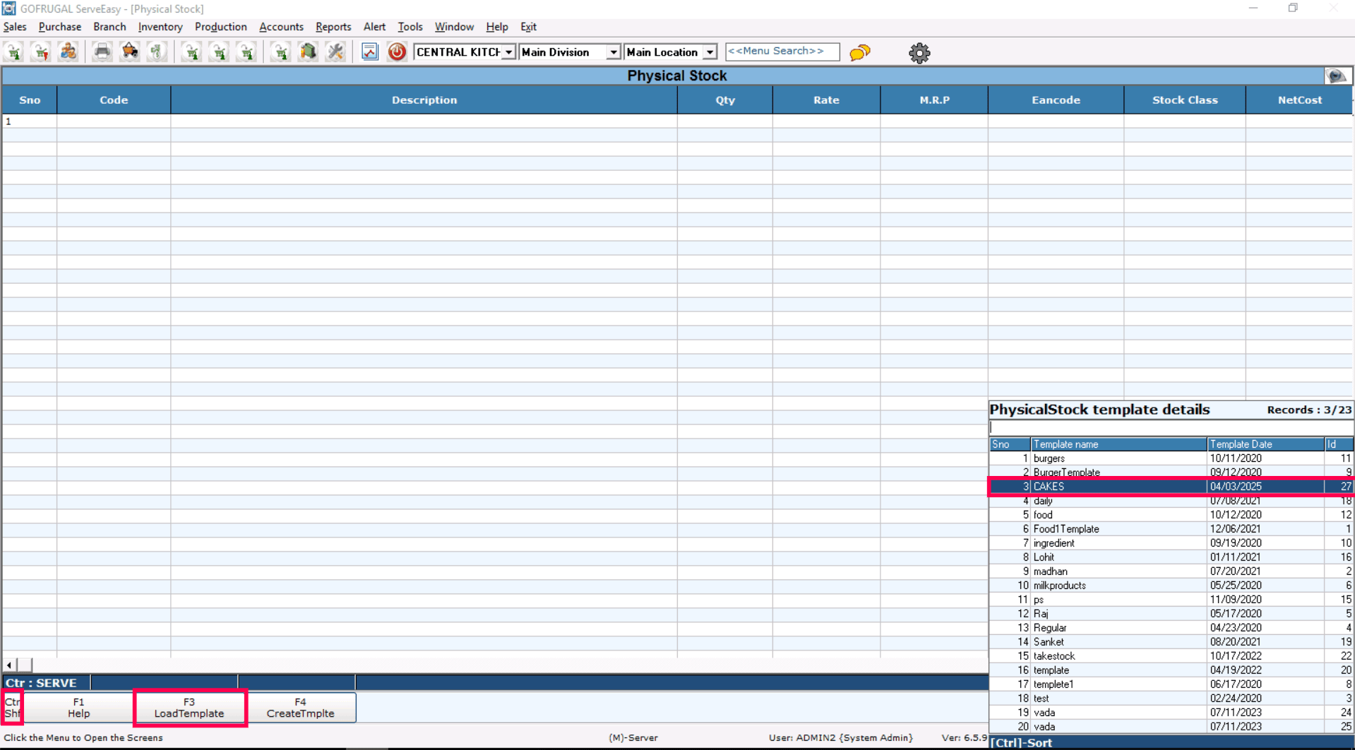 The Physical Stock Template screen in GOFRUGAL HQ allows users to create predefined templates that can be loaded in the outlet POS for recording physical stock details.