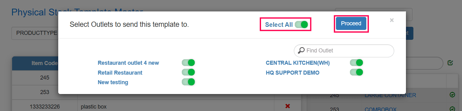 Use the Select All toggle or choose the required outlets or branches, then click the Proceed button to continue.
