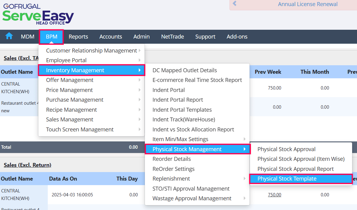 The following section explains the steps to create and send the physical stock template from HQ to the outlets.