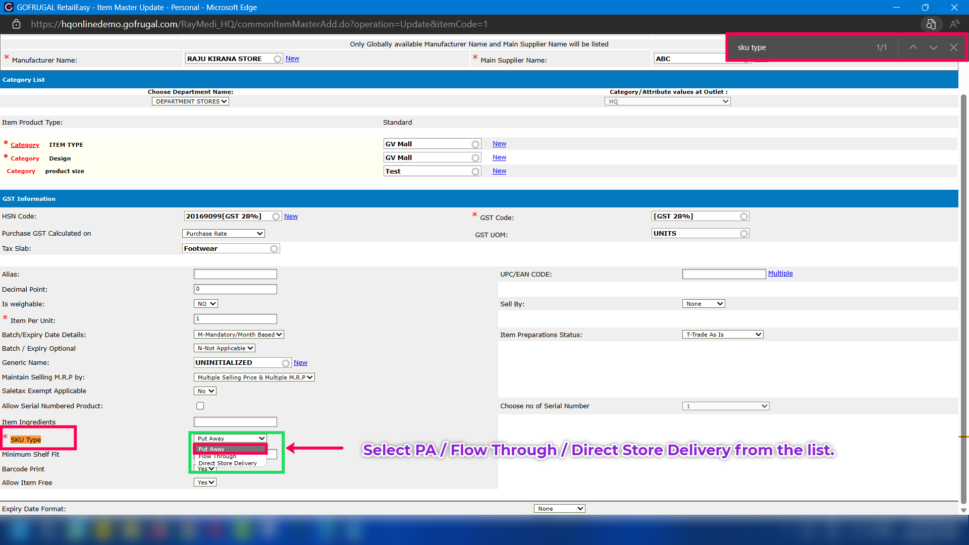 Step 4: Locate the SKU Type and select Put Away / Flow Through / Direct Store Delivery as per you need.