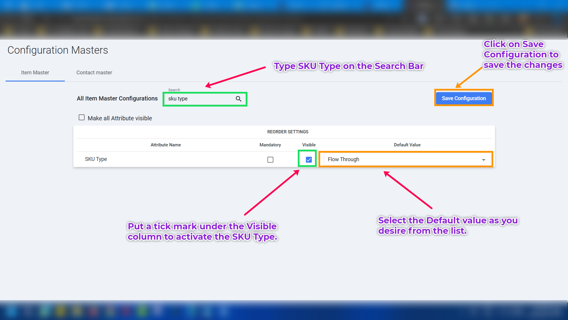 1. If the SKU Type is not listed in the Item Master do the following to activate the same.