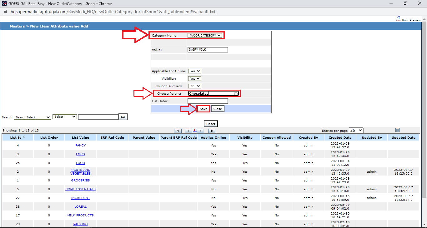 For example, a customer wants to create the Category as 'Chocolates' & Sub-Category as 'Dairy'.