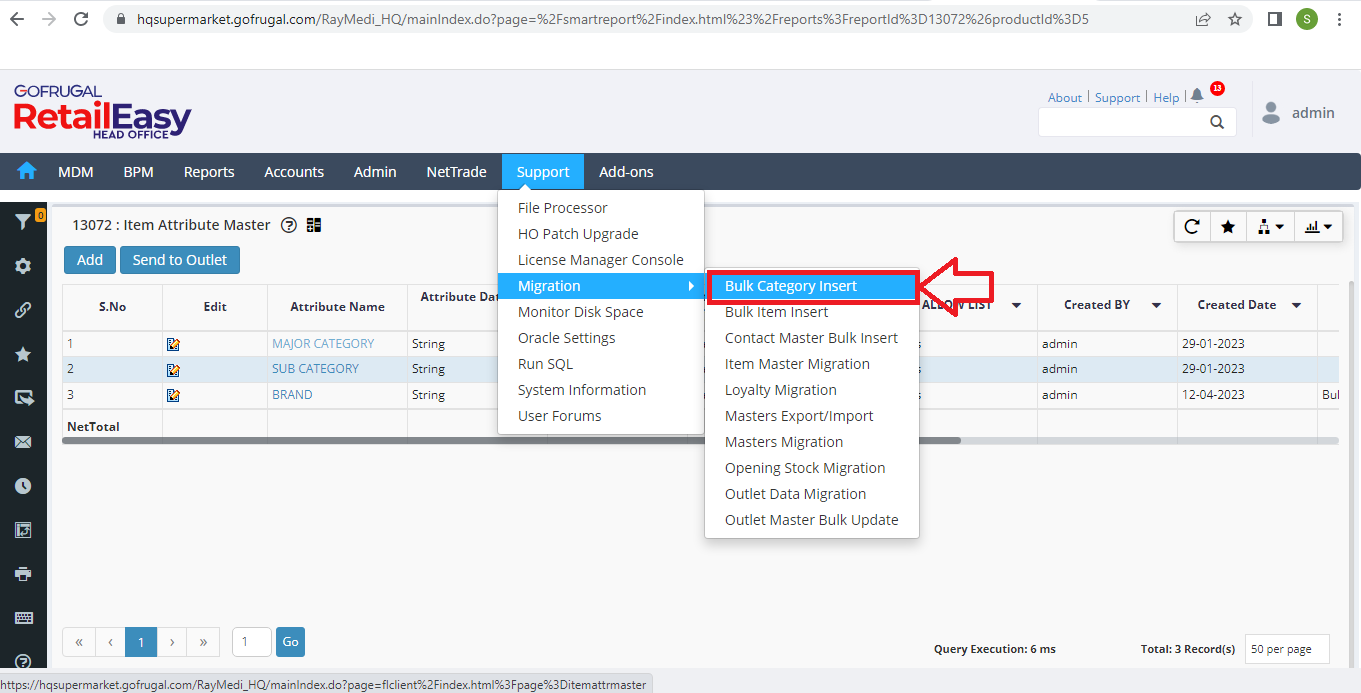 Step 1: Go to Support > Migration > Bulk Category Insert.