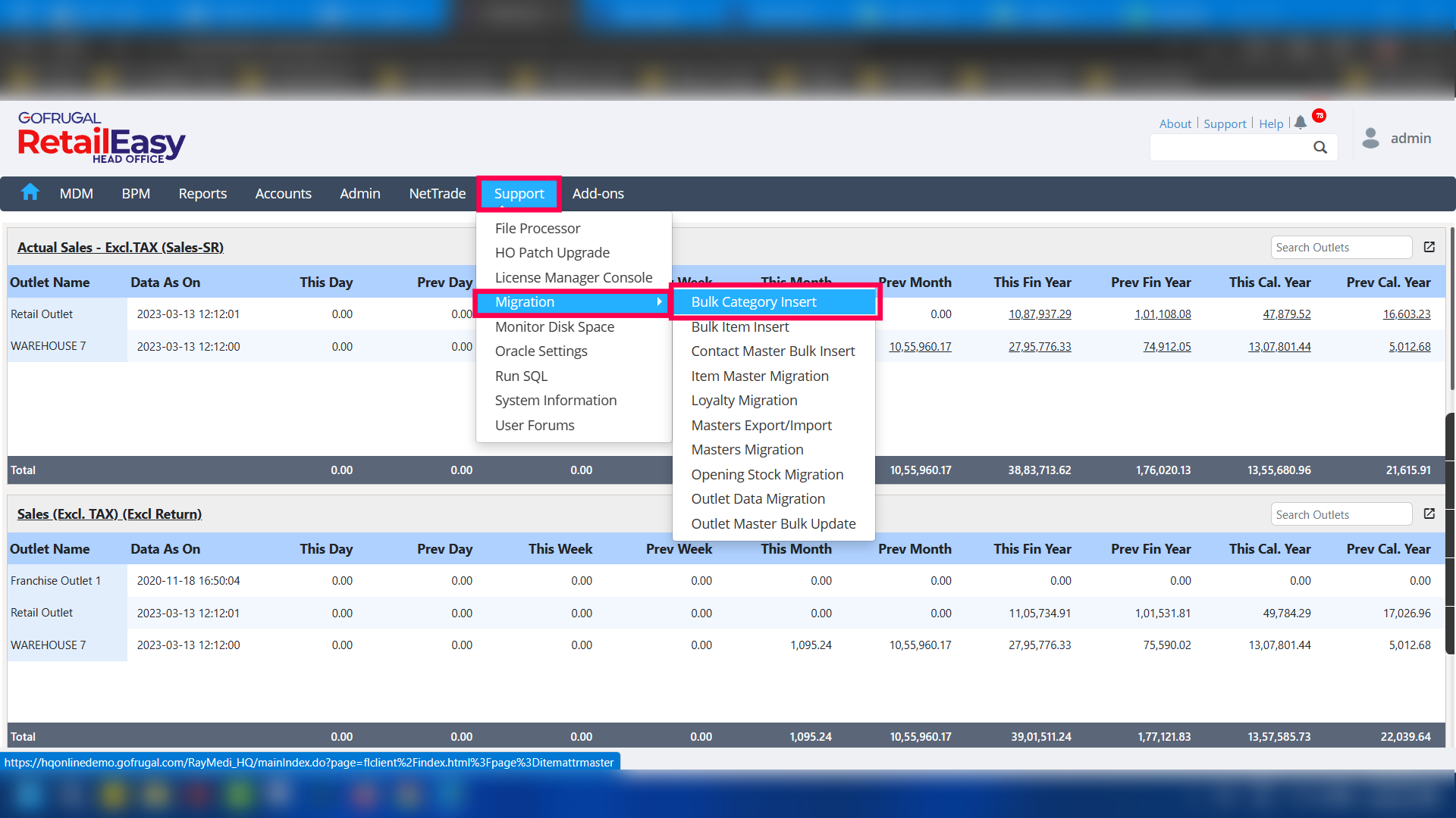 Step 1: Go to Support > Migration > Bulk Category Insert.