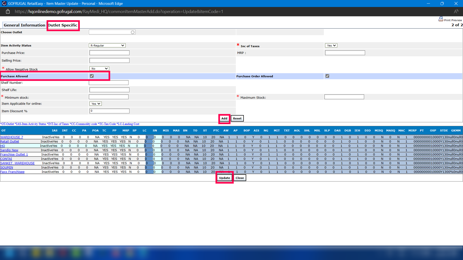 Step 3: Click on Outlet Specific tab and locate Purchase Allowed option. Put a tick on the check box to allow purchase. Remove the tick to disable purchase.