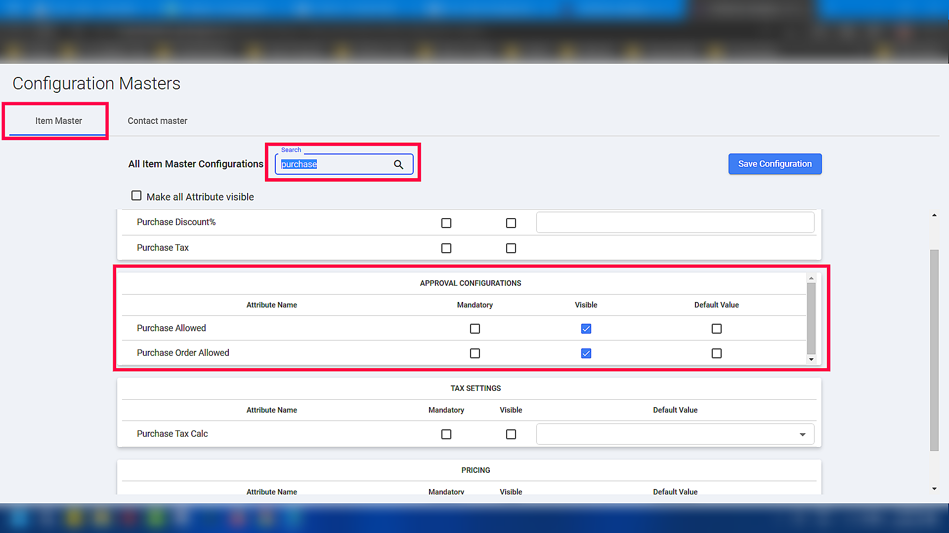 Step 2: Search for the keyword "Purchase" in the search box. Then put tick on visible option for Purchase Allowed.