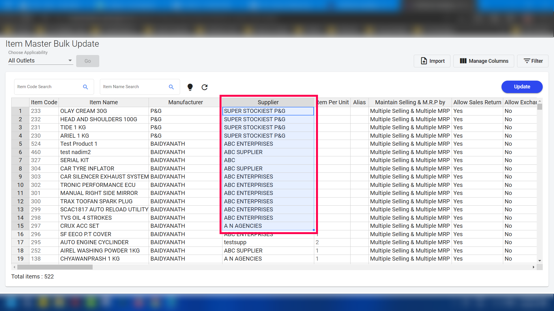 Step 3: Locate the Supplier column and filter the items you want and double click on the supplier names and Update.