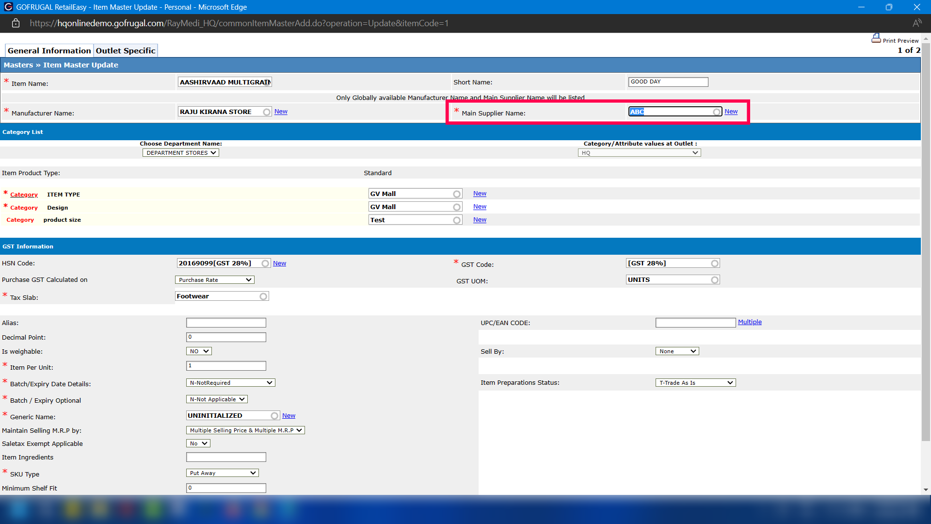 To update the Primary Supplier or the Main Distributor for an Item / set of Items, follow the steps below: