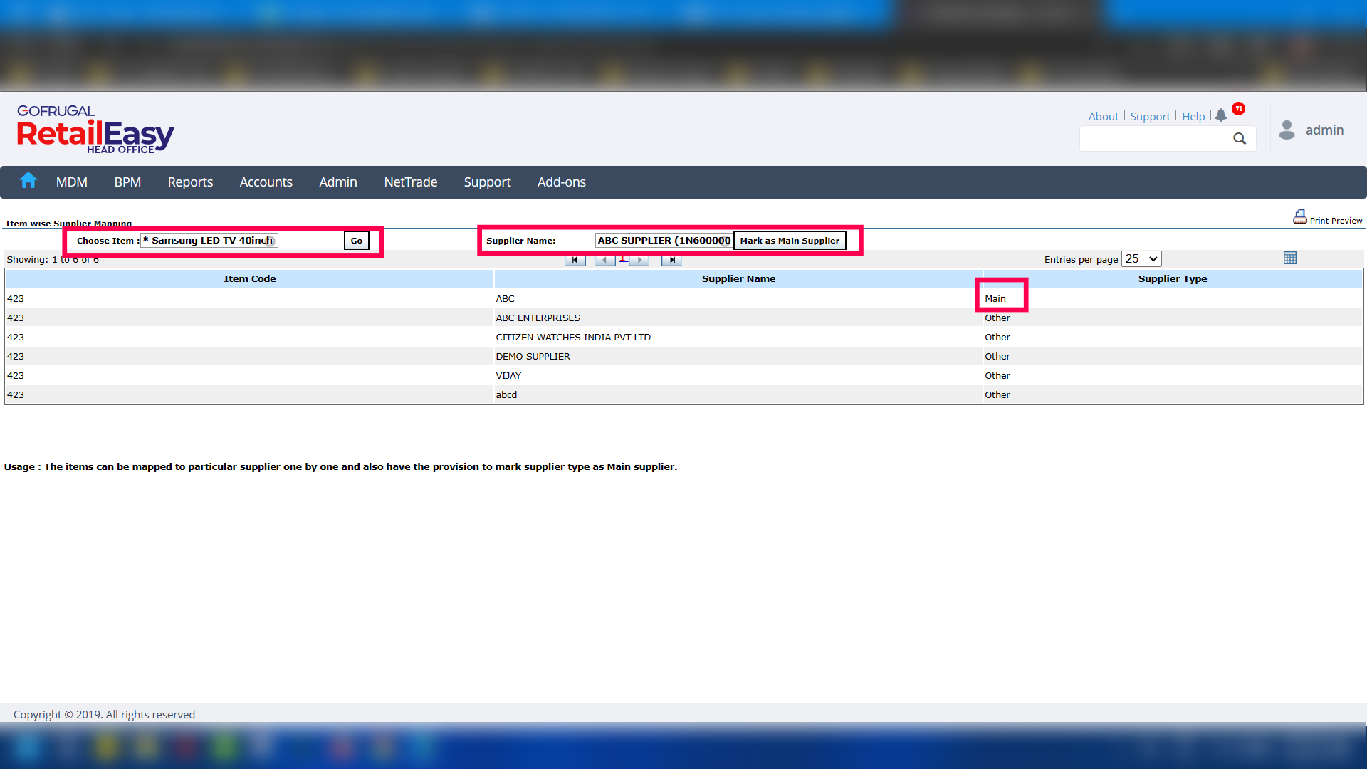Step 3: Press Space Bar and select the desired Supplier from the Supplier list and click on Mark as Main Supplier to make the selected supplier as the Main Suppler.