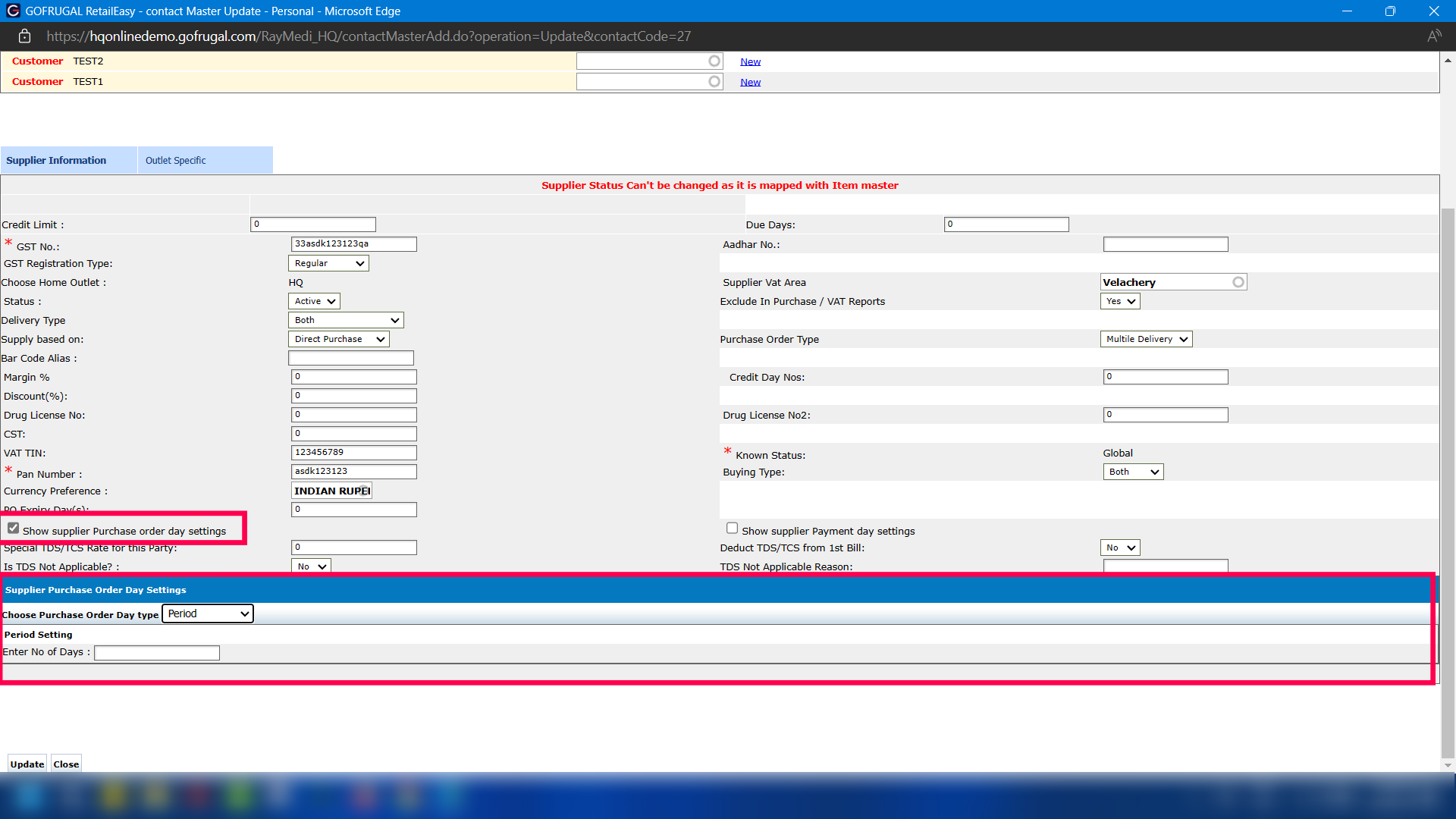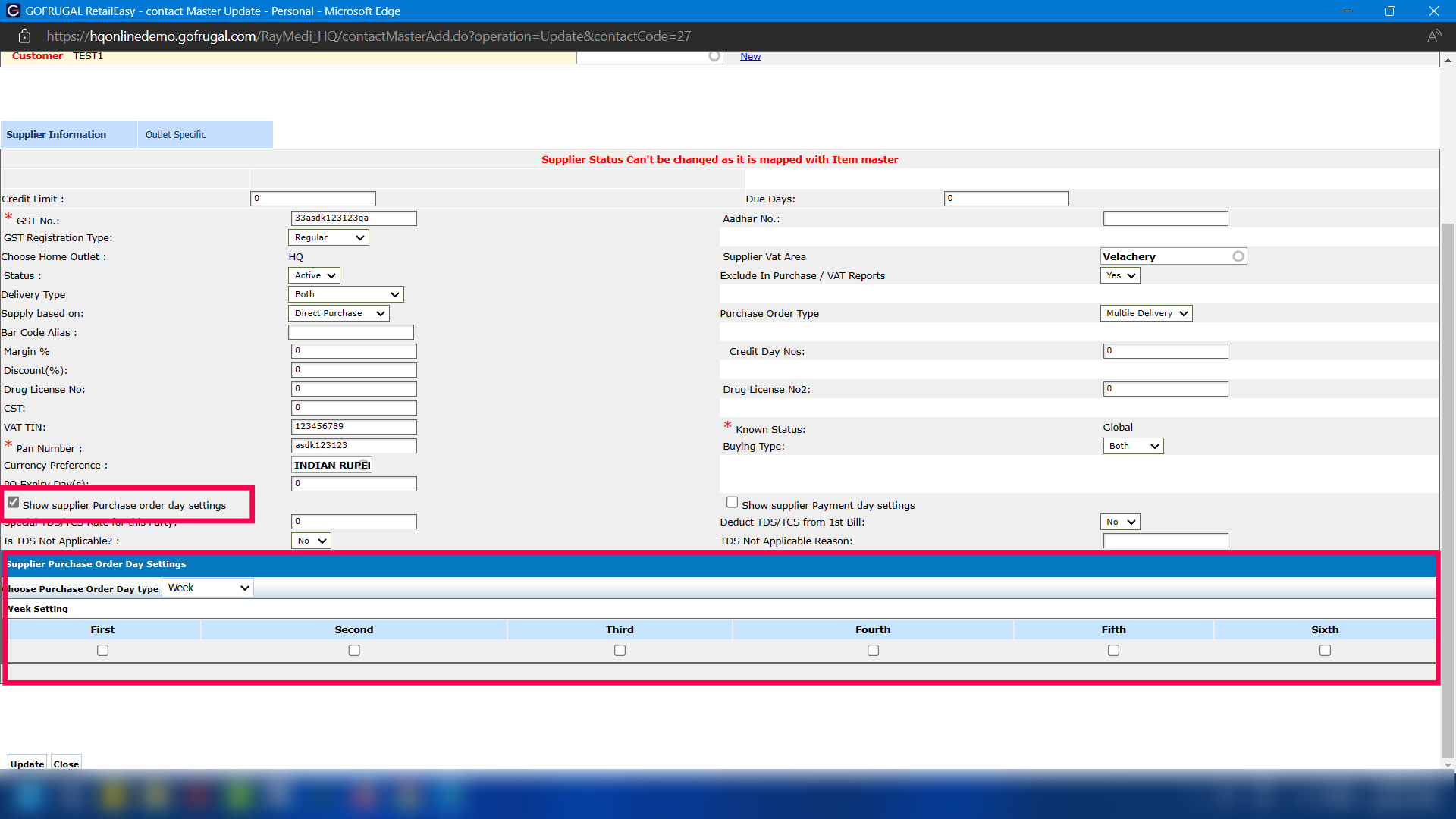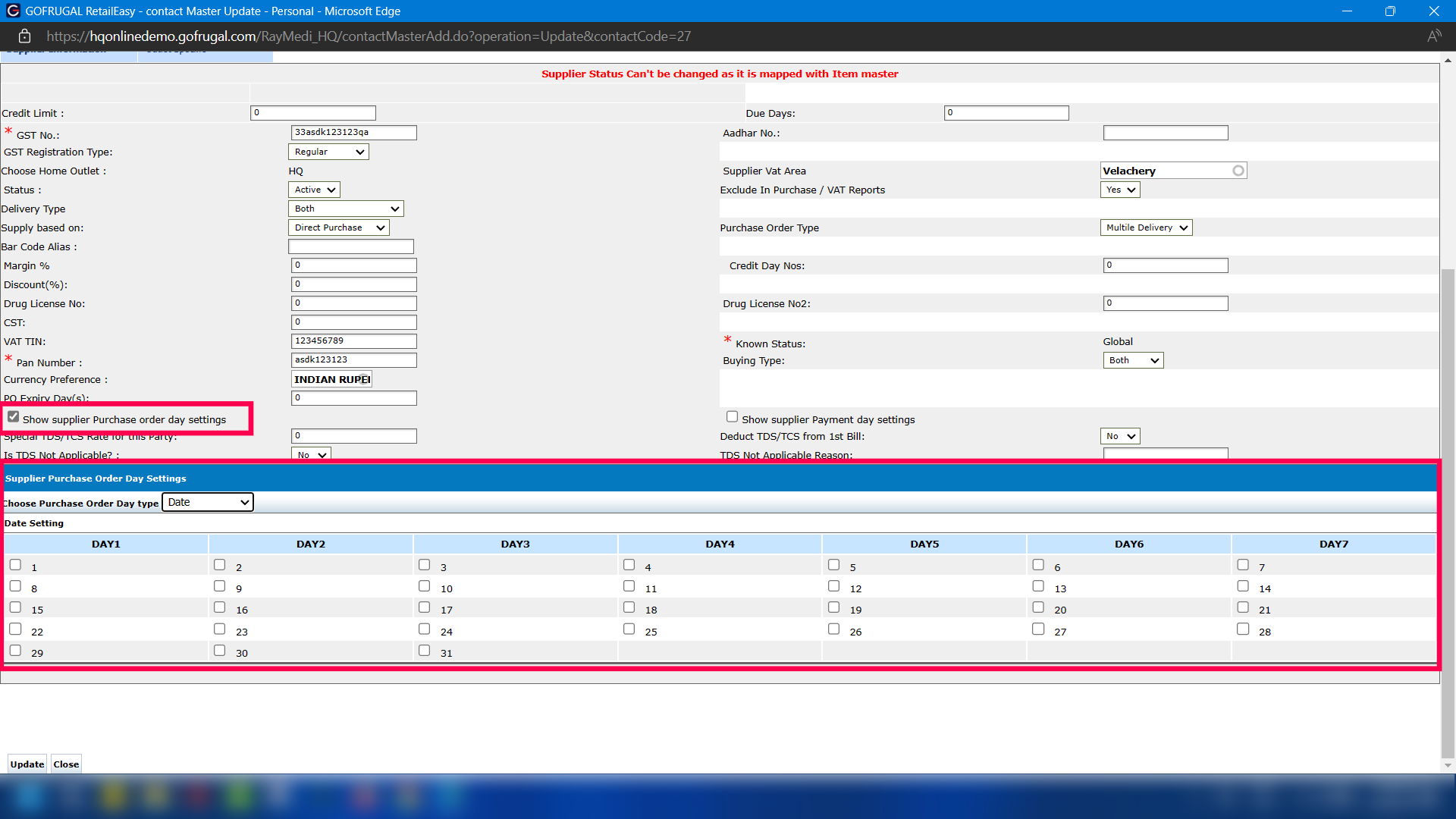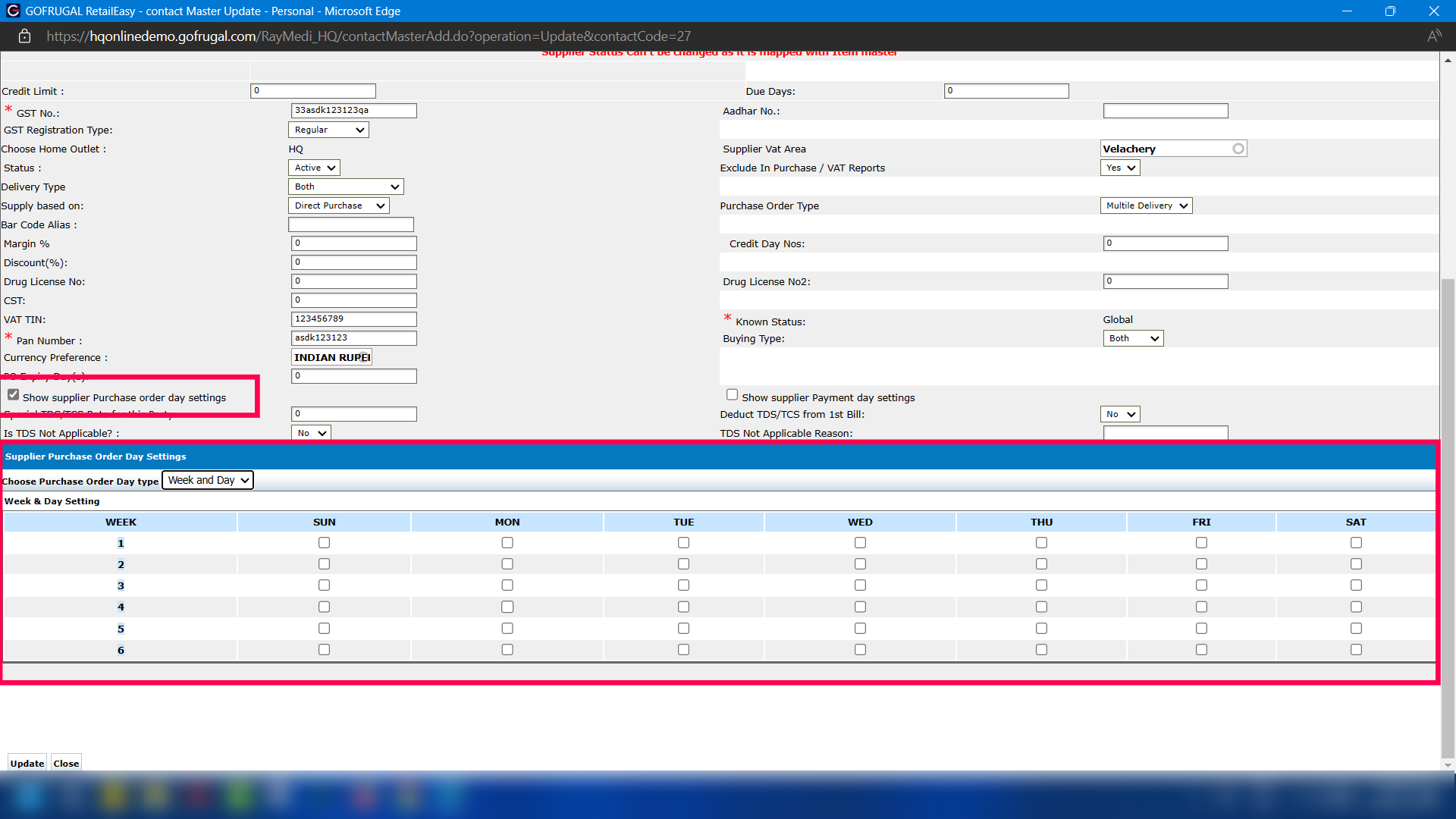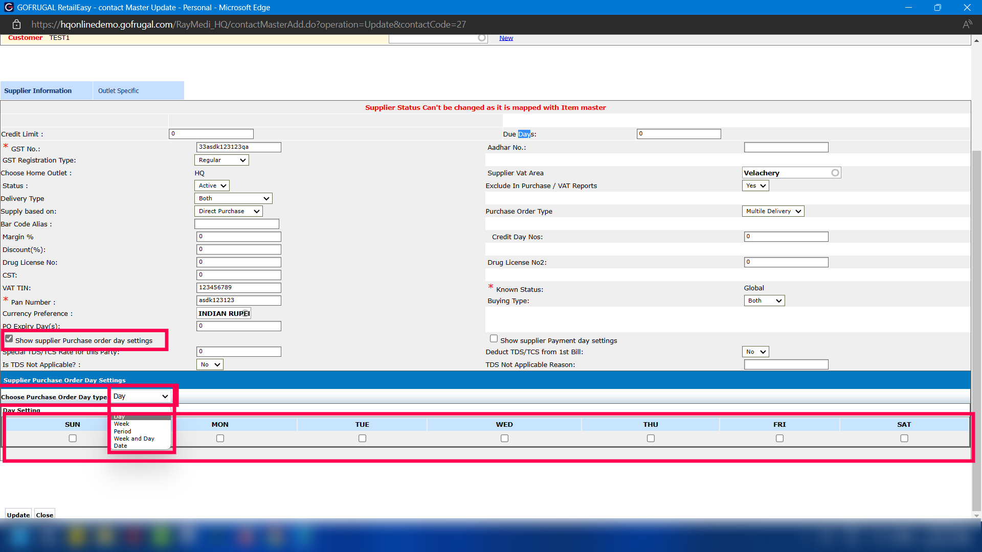 Step 4: Select the desired dropdown from "Choose Purchase Order Day type" and Update.