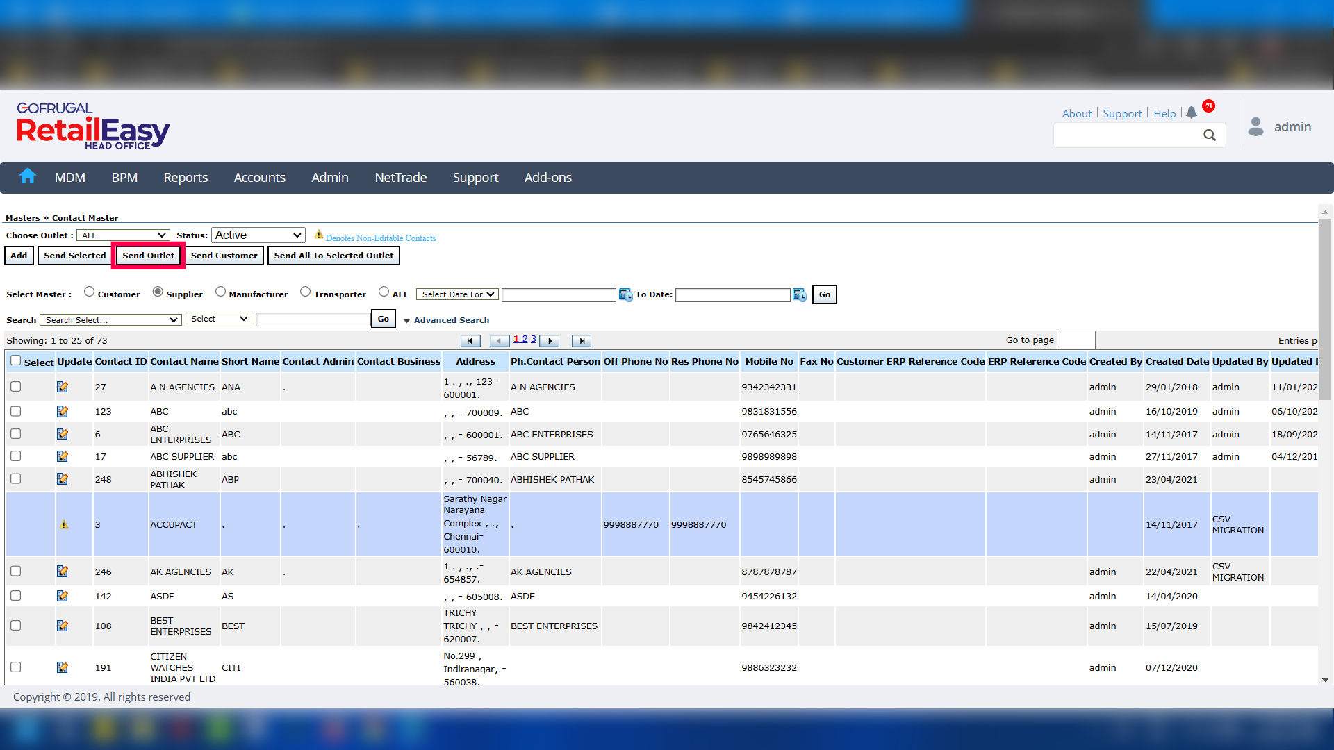 Step 5: Click on "Send outlet" or the other sending options from the page to send the suppliers in your outlets.