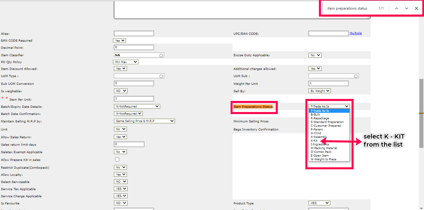 Step 4: Locate the Item Preparation Status field and select K - KIT from the list.