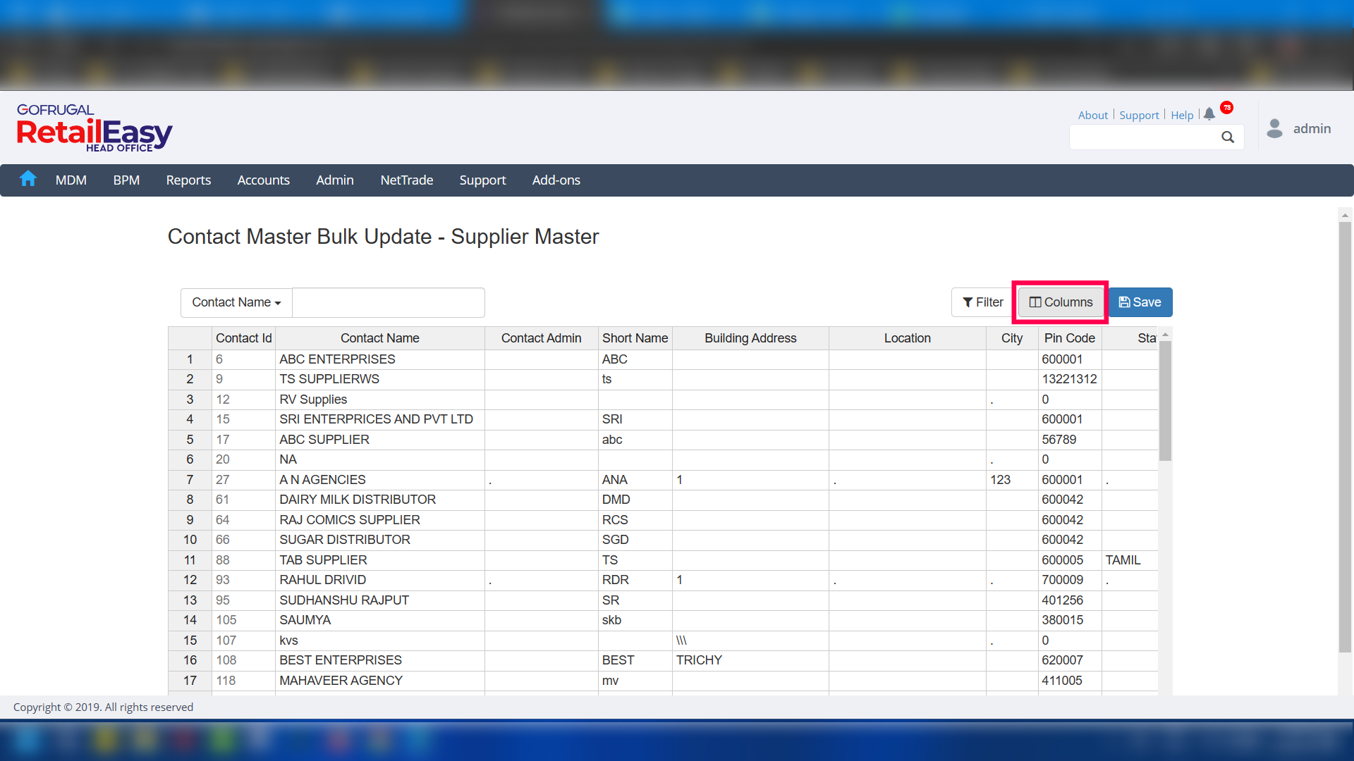 Step 3: Click on Columns button to open the column selection screen.