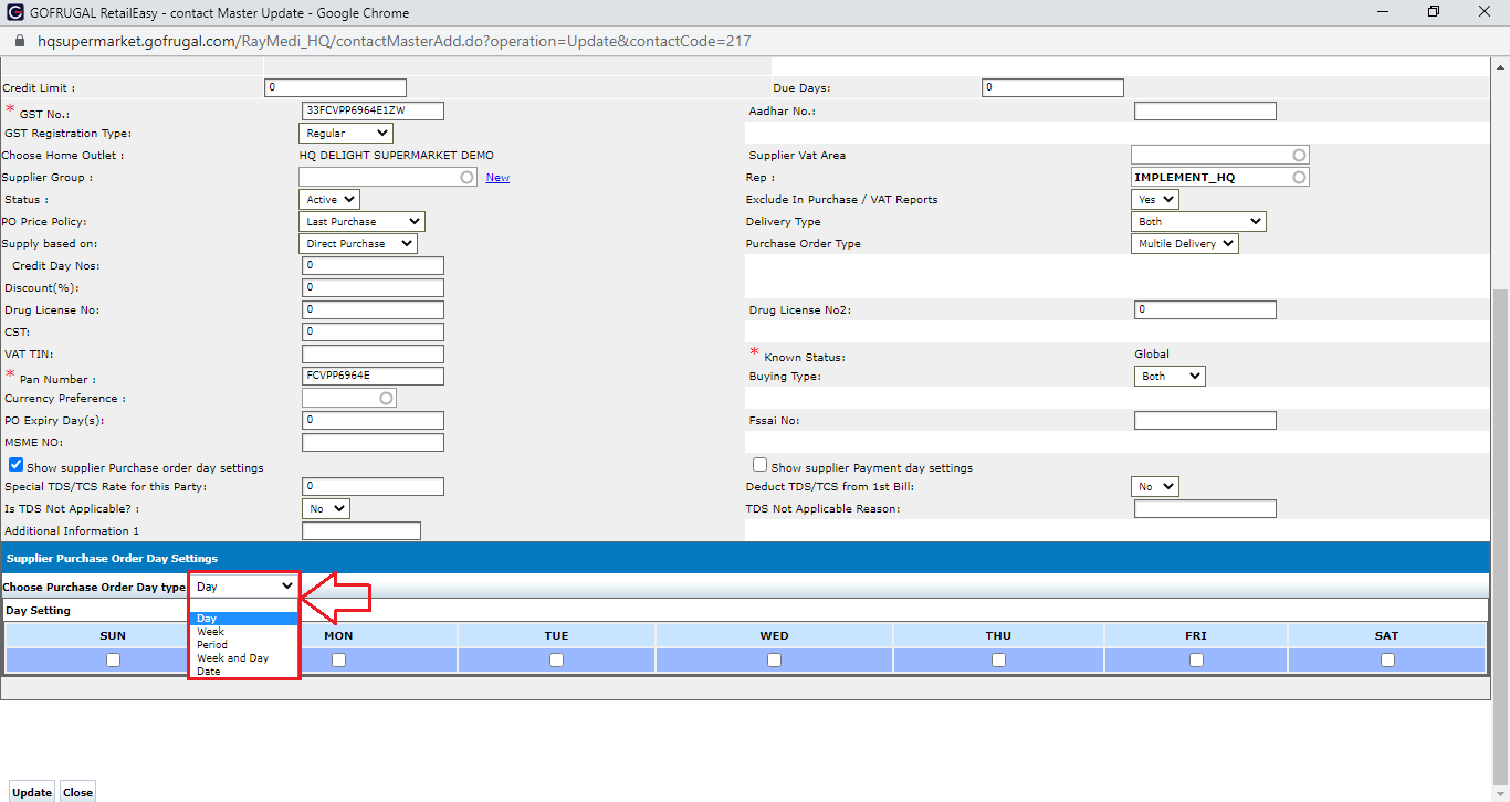 Step5: Choose Purchase Order day type, select Day, Week, Period, Week & Day, Date.