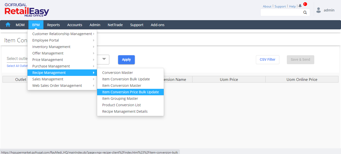 Step 1: Go to BPM > Recipe Management > Item Conversion Price Bulk Update.