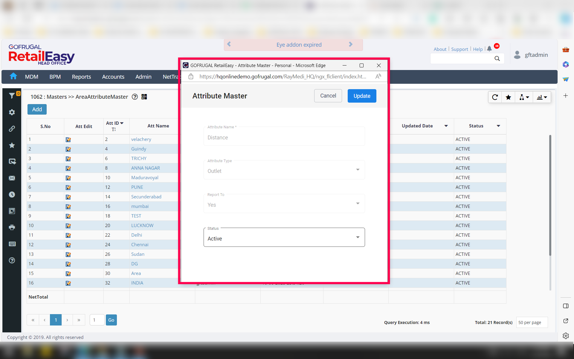 Step 3: In the Area Attribute Master, put the Attribute Name, Attribute Type = Outlet or HQ, Report To = Yes & Status = Active, and click on the "Save" button.