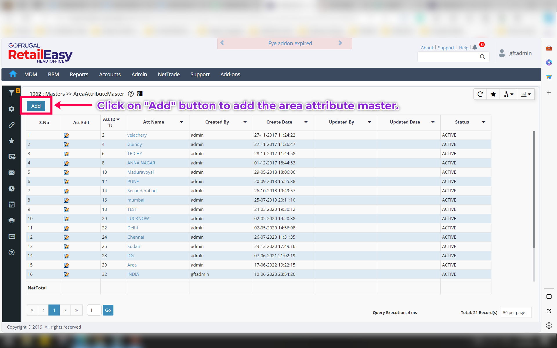 Step 2: Click on the "Add" button to add the Area Attribute Master.