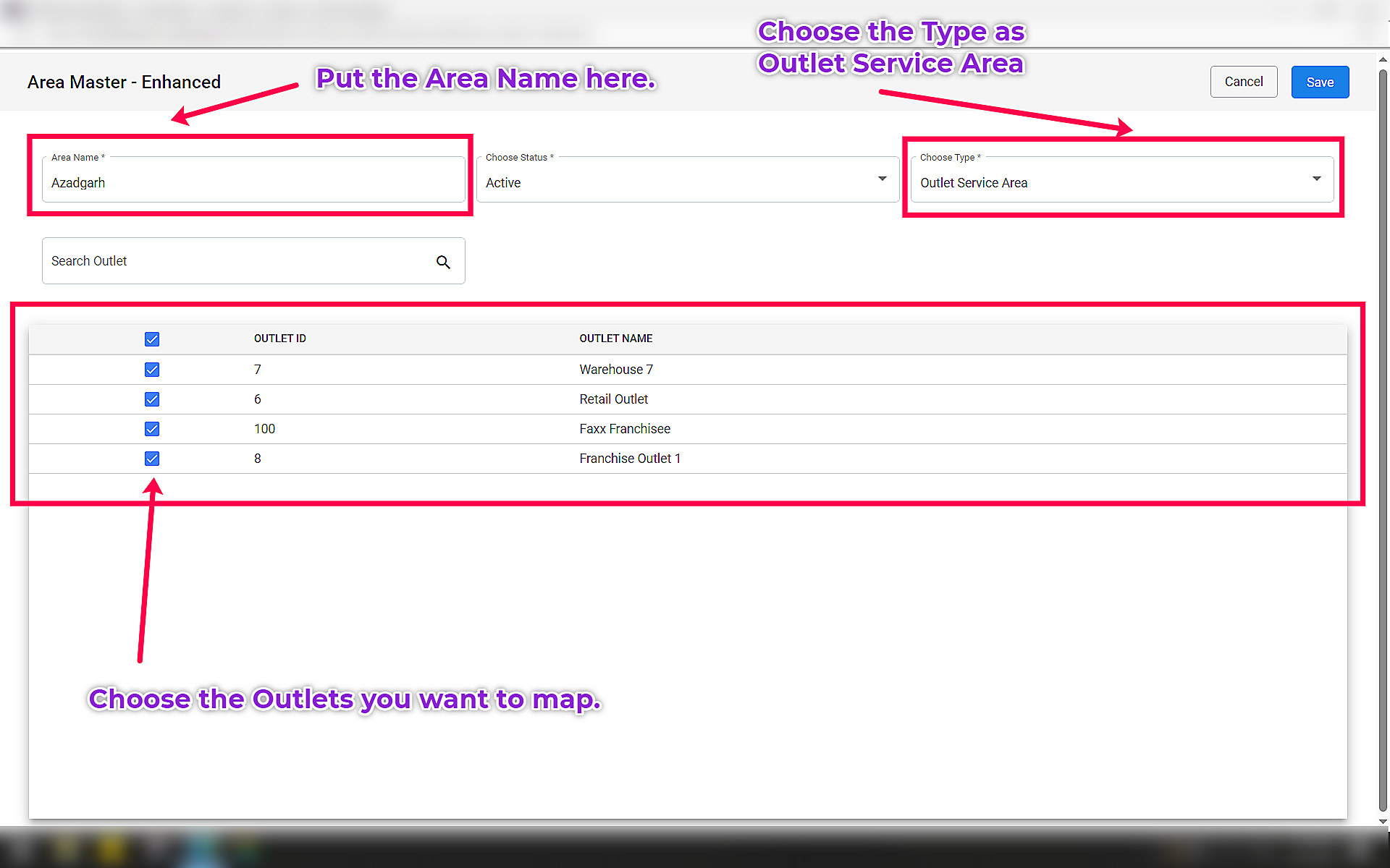 Below are the steps to make the Area Master Enhance along with the Outlet Service Area & Business Service Area:
