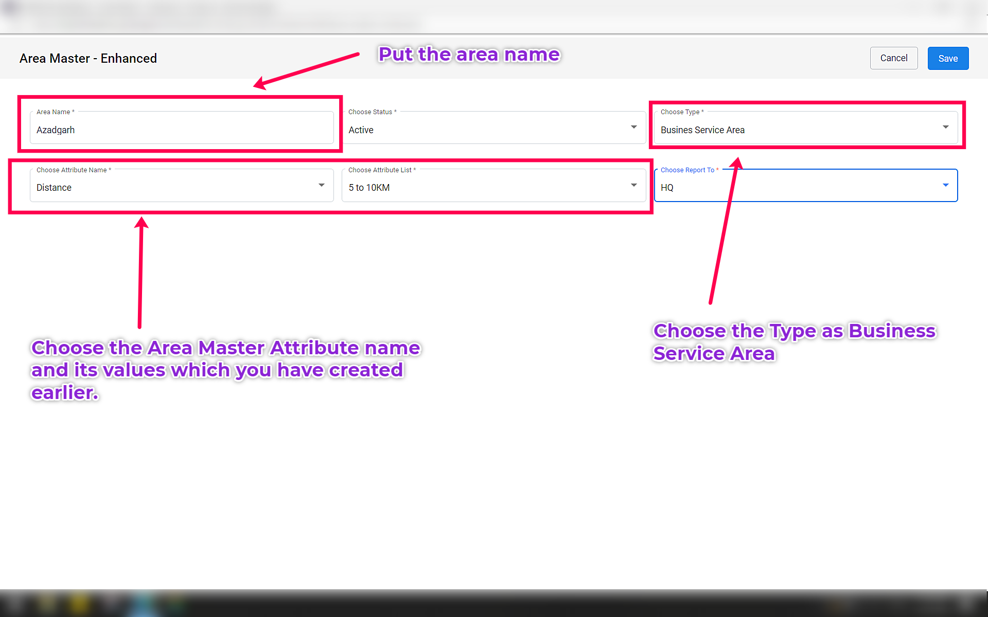 Step 3: Put the Area Name, Status, Type = Business Service Area. When we select the Type as Business Service Area, we can select the Area Attribute Master we had created earlier along with its values. Then put the Report to = HQ.