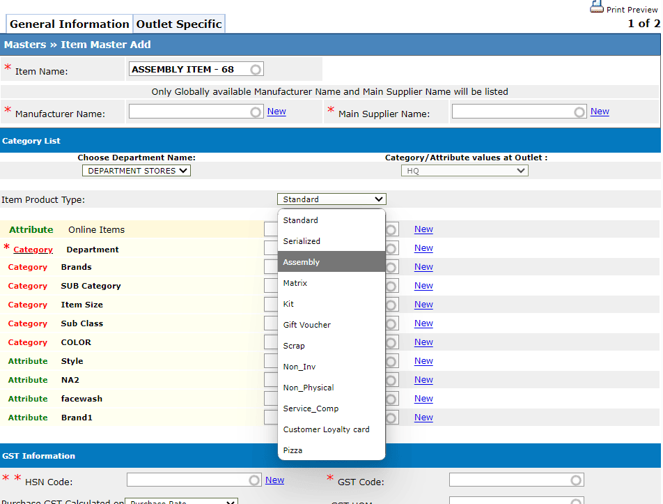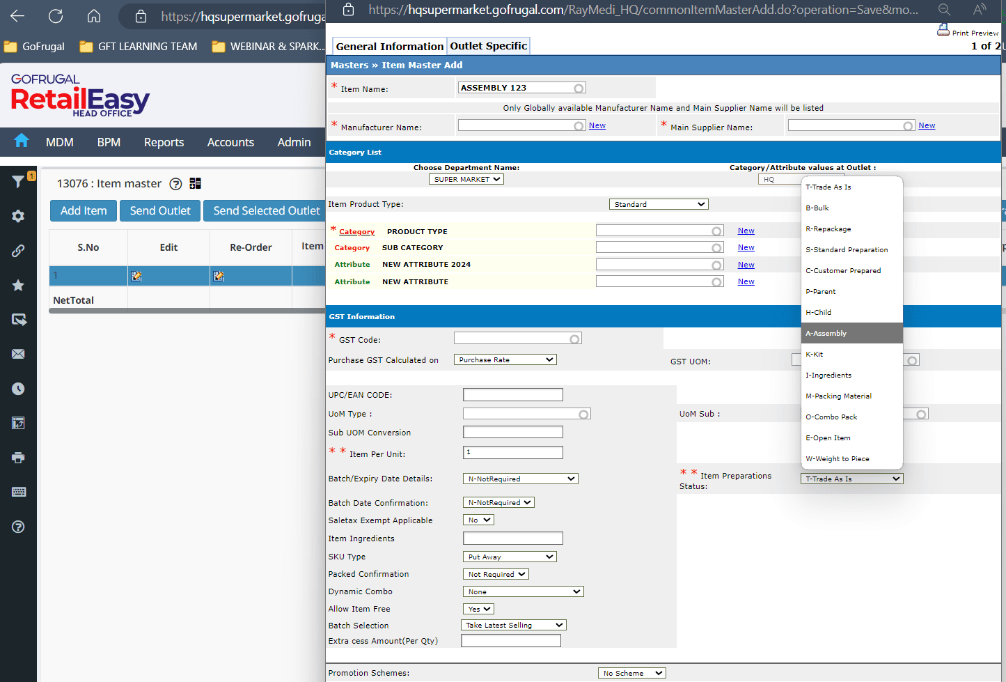 Step 3: Put all the necessary information about the item and locate "Item Preparation Status" and select "A-Assembly" from the list.